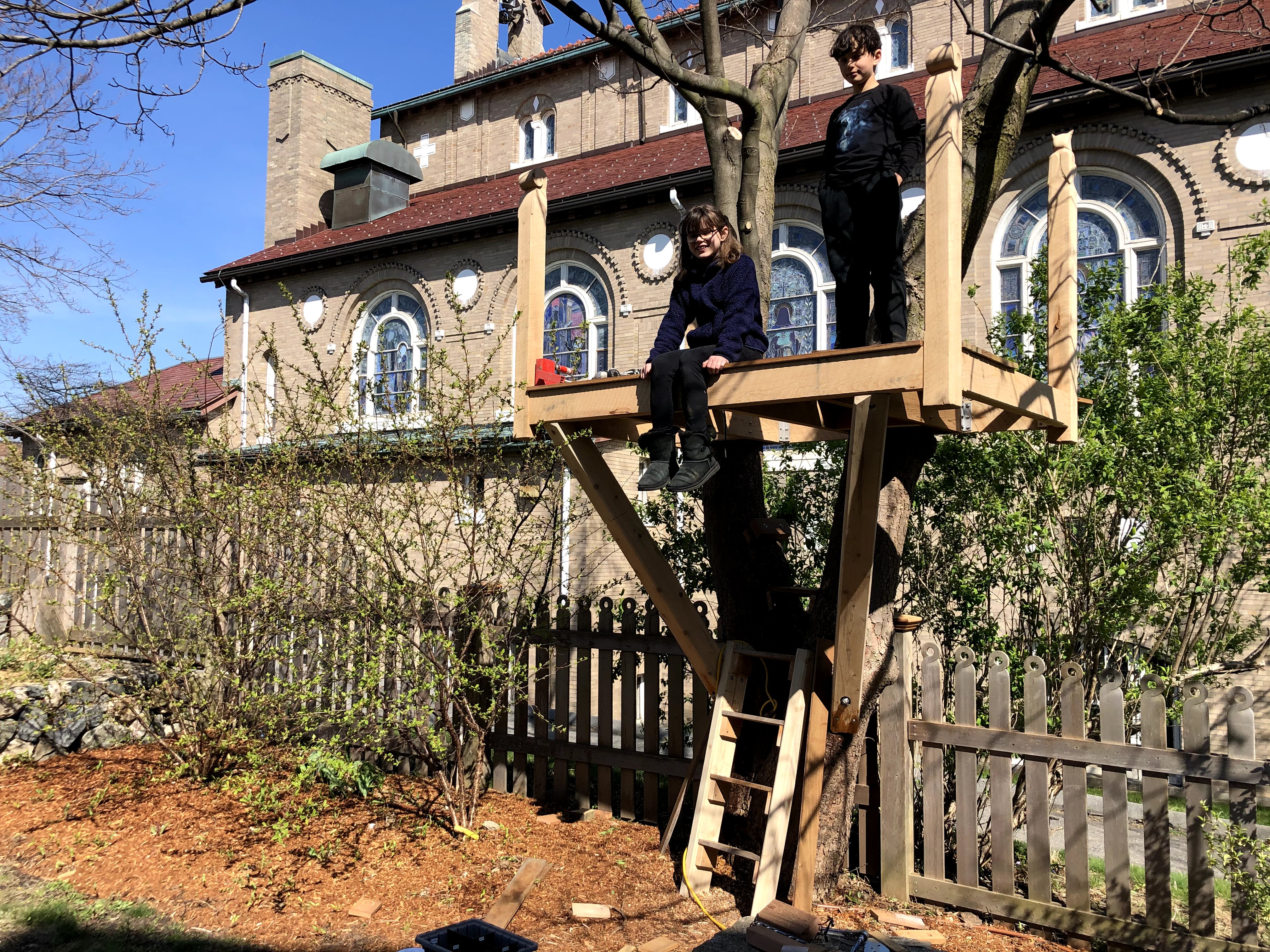I am hired back to my job now, but am working from home mostly for the time being. Before that happened for a few weeks my son and I pushed to get a little tree platform built that I’ve been meaning to do for years On the right in below photo: