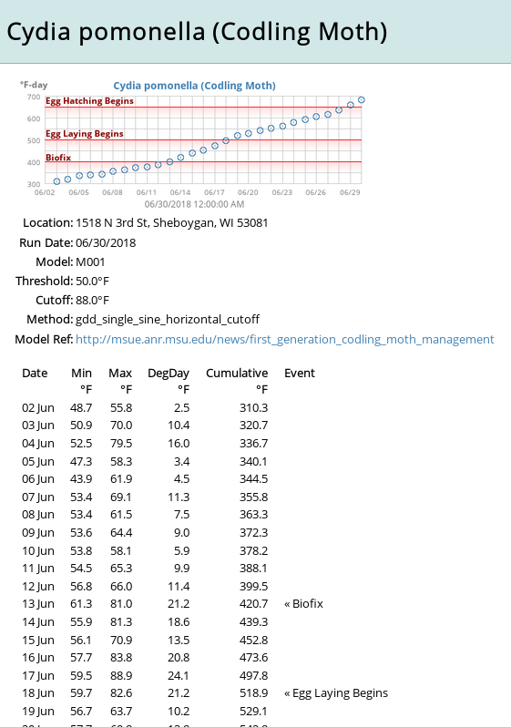 I used to call my extension “Cydia” for Cydia pomonella (codling moth) because I needed it to tell me when cover sprays were due. My recent work has broadened its applicability to over 200 different developmental models for over 100 different insects. I now call it the WeeWX Phenology Extension. WeeWX Linux Users are invited to download the “tarball” from: