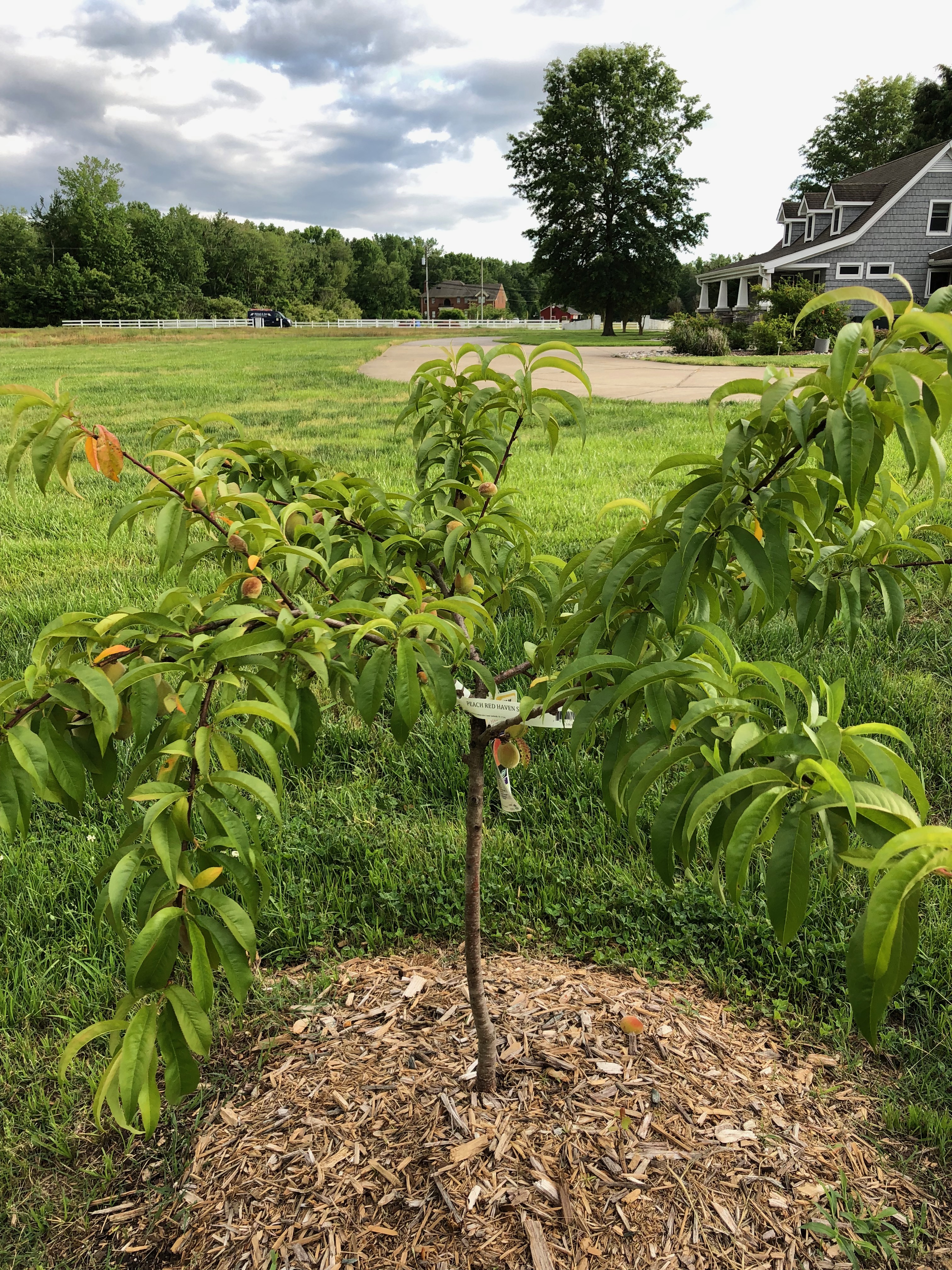 Attached is a photo of our 3 Red Havens, closest 3 trees. The trees farther away are Cherry trees. You can see a small pile of water sprouts at the base.