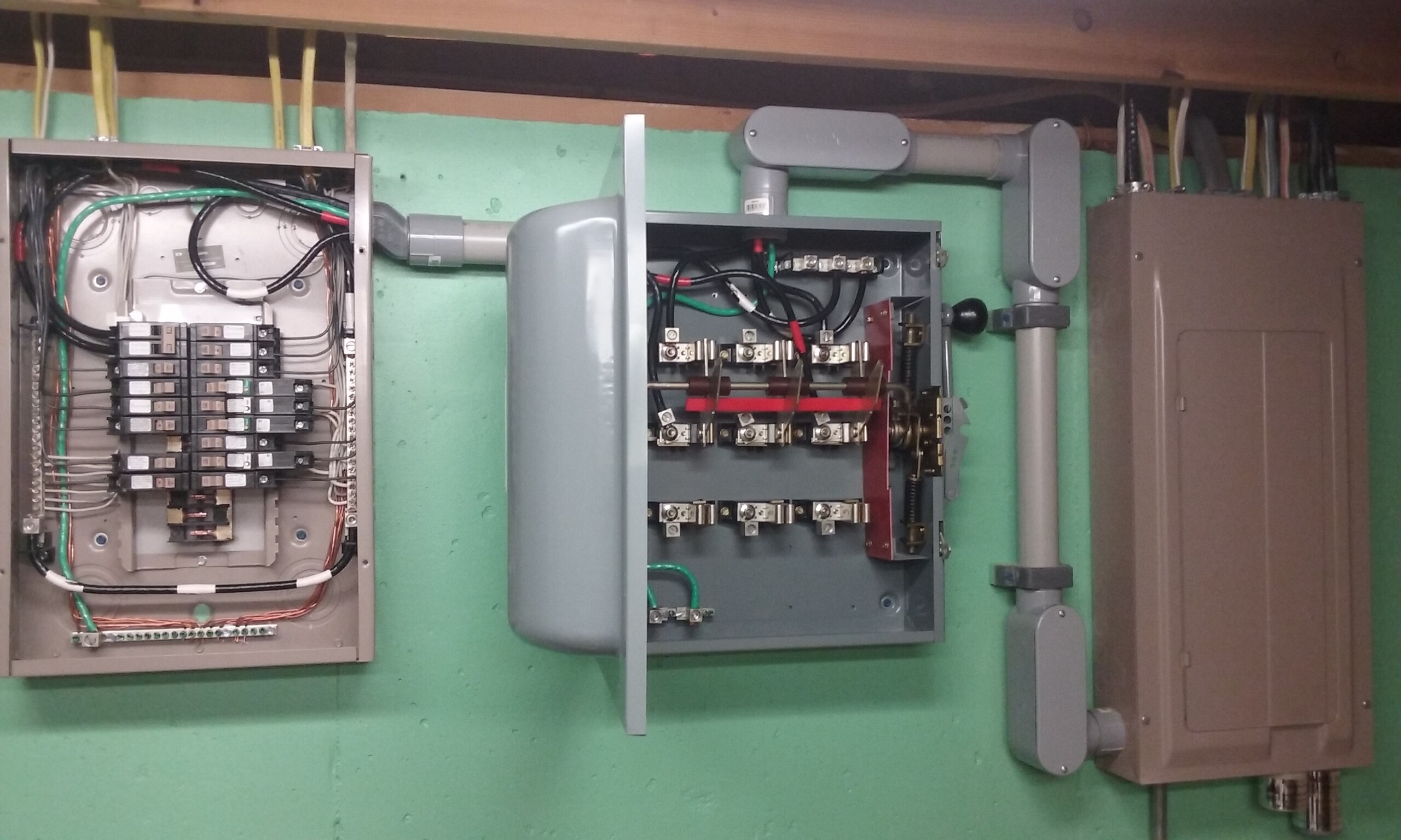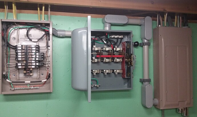 Here’s a double throw transfer switch and sub-panel I installed in my house. Eventually plan to hook up the bottom end of the transfer switch to run an emergency generator.
