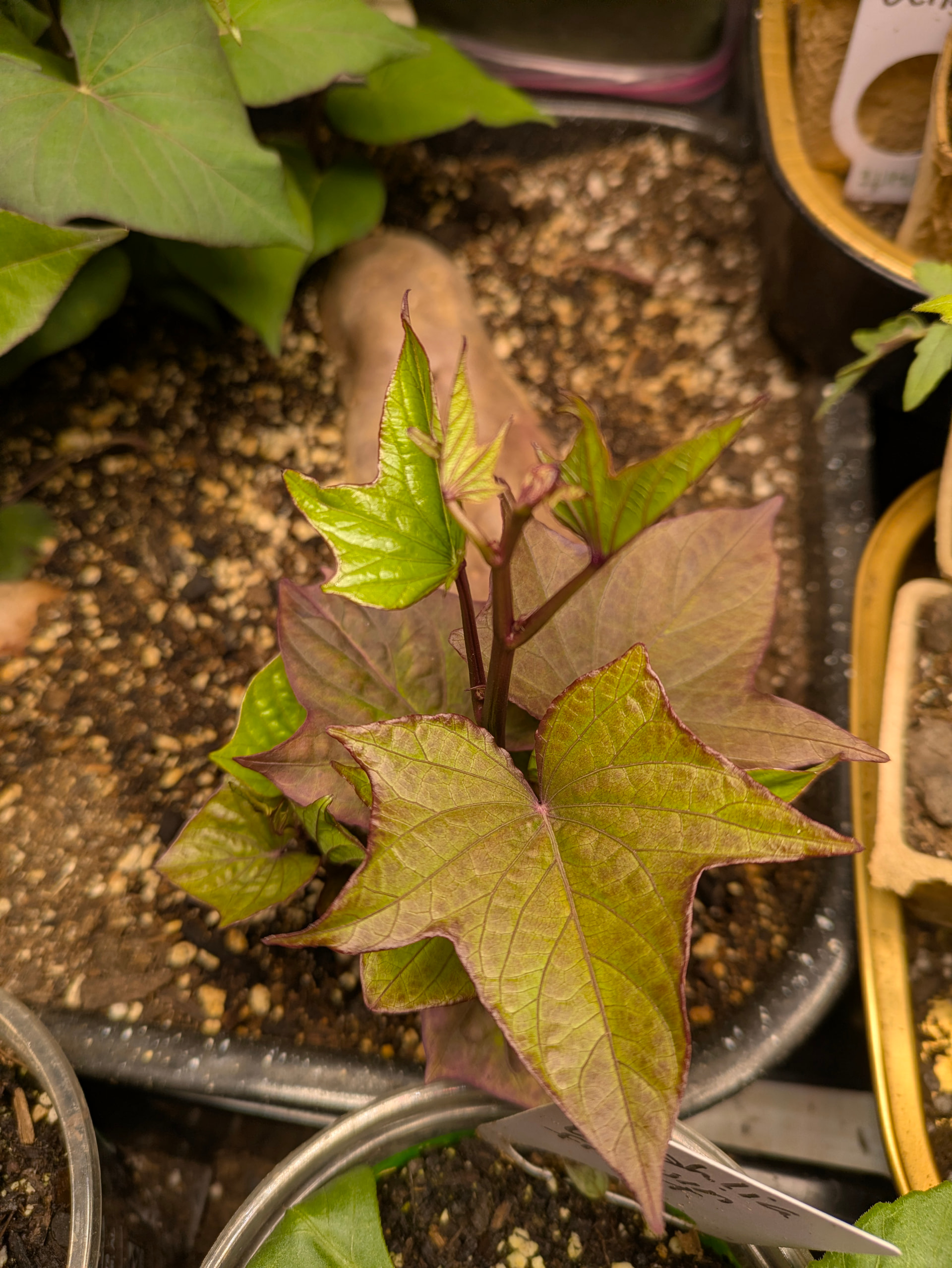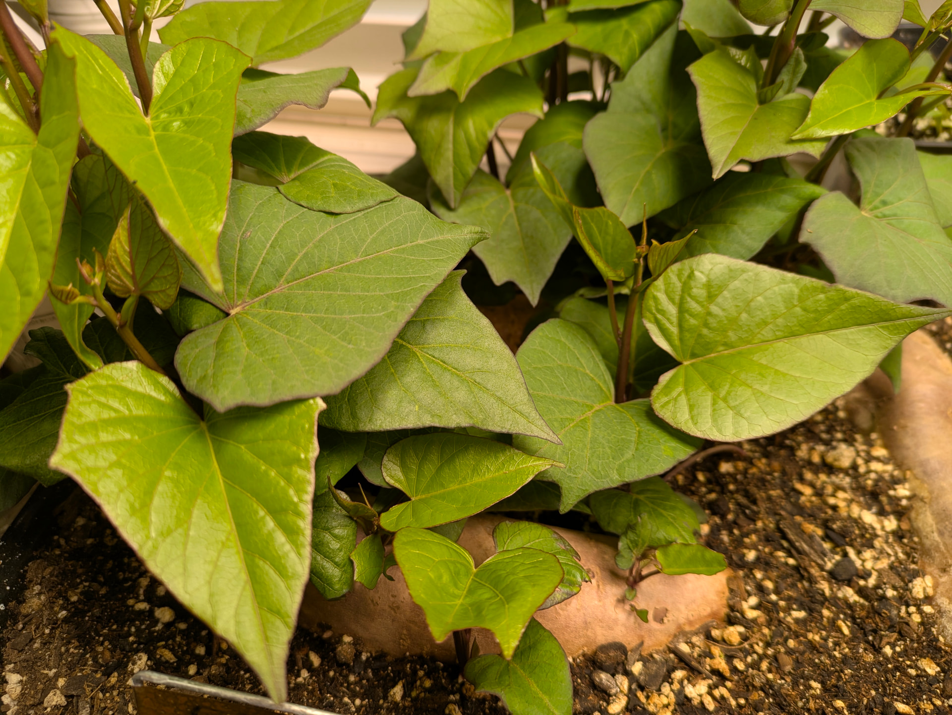 Now that I have the slips going, note the difference - the Stokes variety has heart-shaped green leaves. The “yam” has ivy-shaped leaves with some rustish coloration to it.