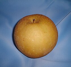Pyrus pyrifolia is a species of pear tree native to southern China and northern Indochina that has been introduced to Korea, Japan and other parts of the world.[1] The tree’s edible fruit is known by many names, including Asian pear,[2] Persian pear, Japanese pear,[2] Chinese pear,[2][3] Korean pear,[4][5][6] Taiwanese pear, apple pear,[7] zodiac pear, three-halves pear, papple, naspati, bata kisbis, Fefeta grained pear and sand pear.[2] Along with cultivars of P. × bretschneideri and Pyrus ussuriensis, the fruit is also called the nashi pear.[8][9] Cultivars derived from Pyrus pyrifolia are grown throughout East Asia, and in other countries such Pakistan, Nepal, Australia, New Zealand, and America. Traditionally in East Asia the tree’s flowers are a popular symbol of early spring, and it is a common sight in gardens and the countryside.