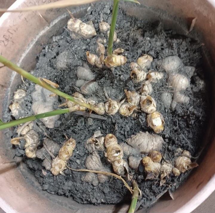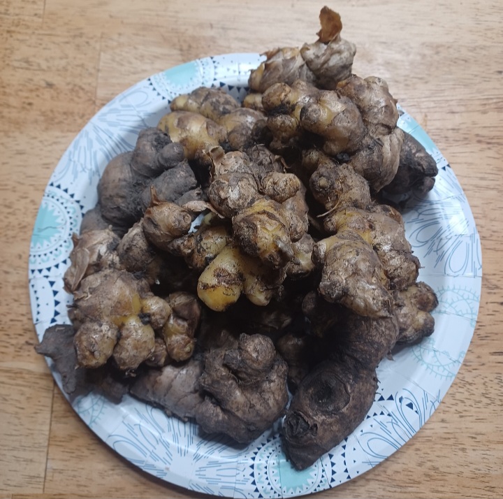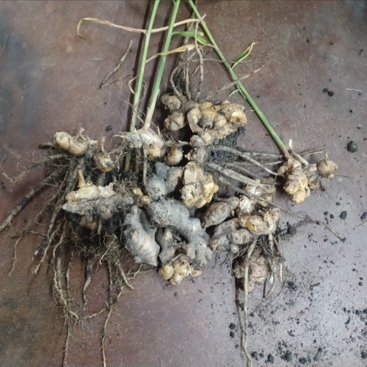 Planted 1 lb, havested 3.23 lb. Probably more like 2 lbs after cleaning though. I suppose one needs to cut the roots off the rhizomes -or can those be eaten also?