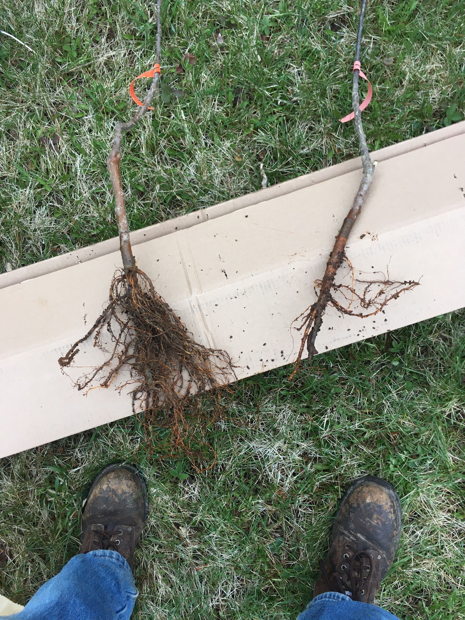 I have 2 apple whips on dwarf rootstock. One has a great root system, the other looks lame in comparison. Should I be concerned about the second wimpier set of roots. Both trees are about 38" tall. Maybe I should cut a foot of the top of the wimpier one?