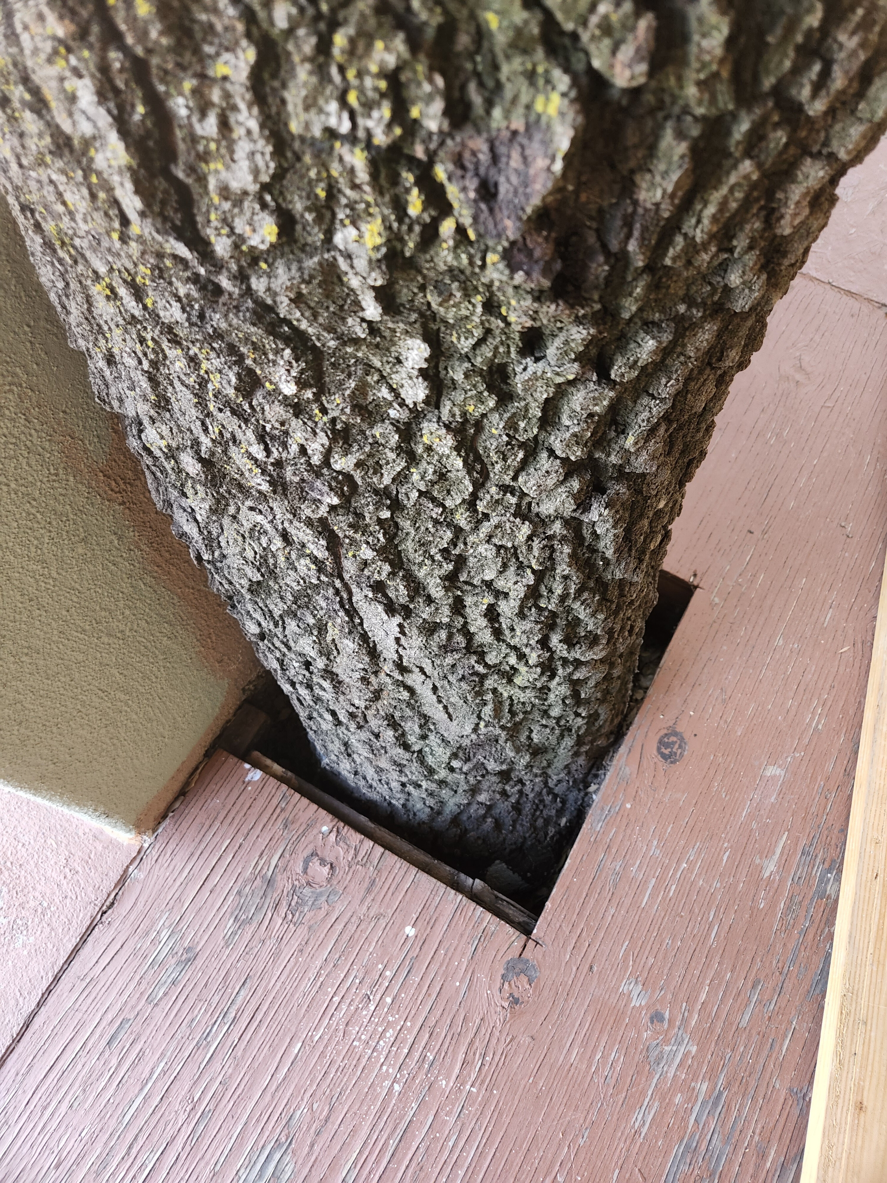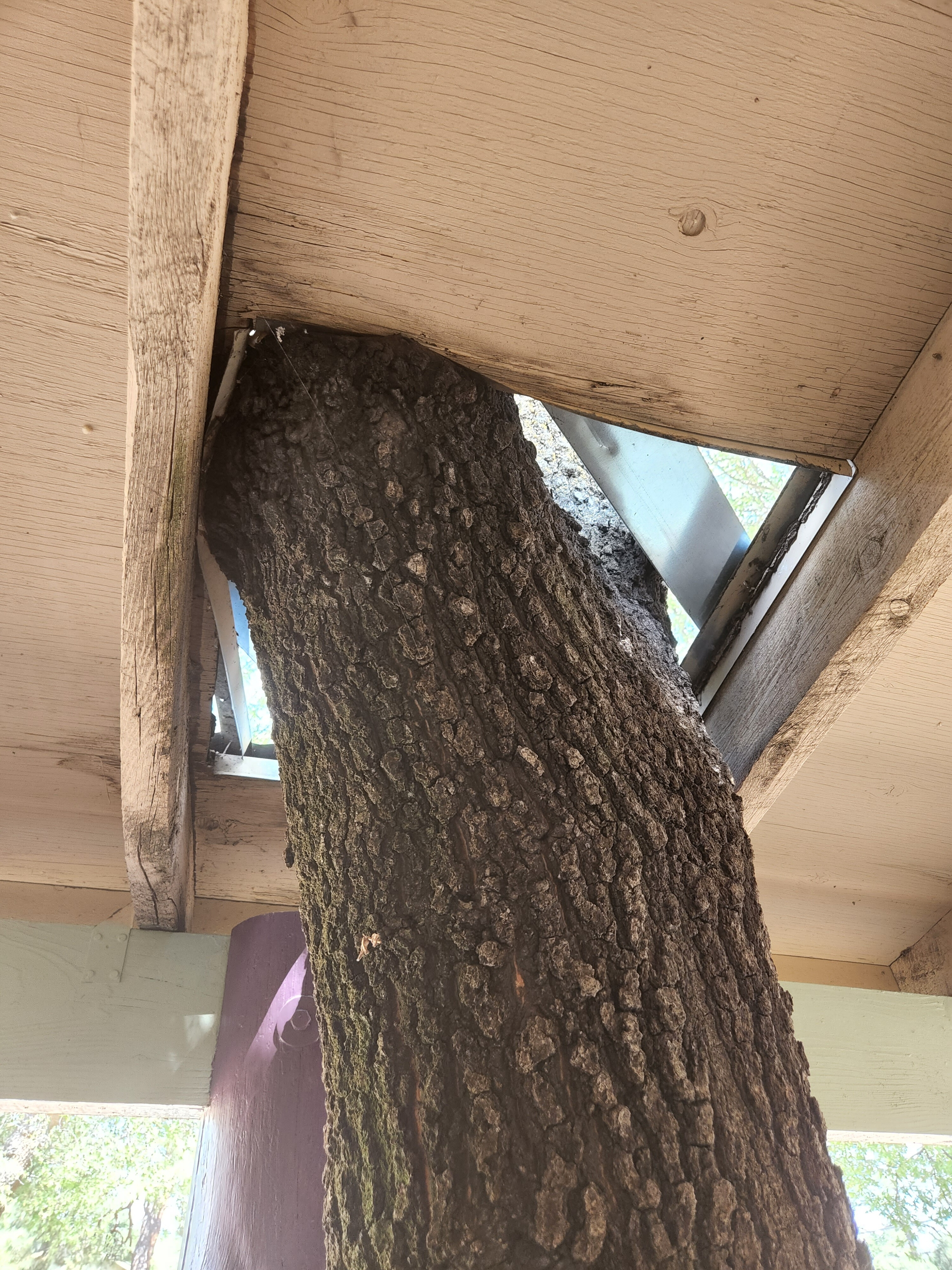 There is a tree,that the earlier home owners let grow up through the deck and roof above.