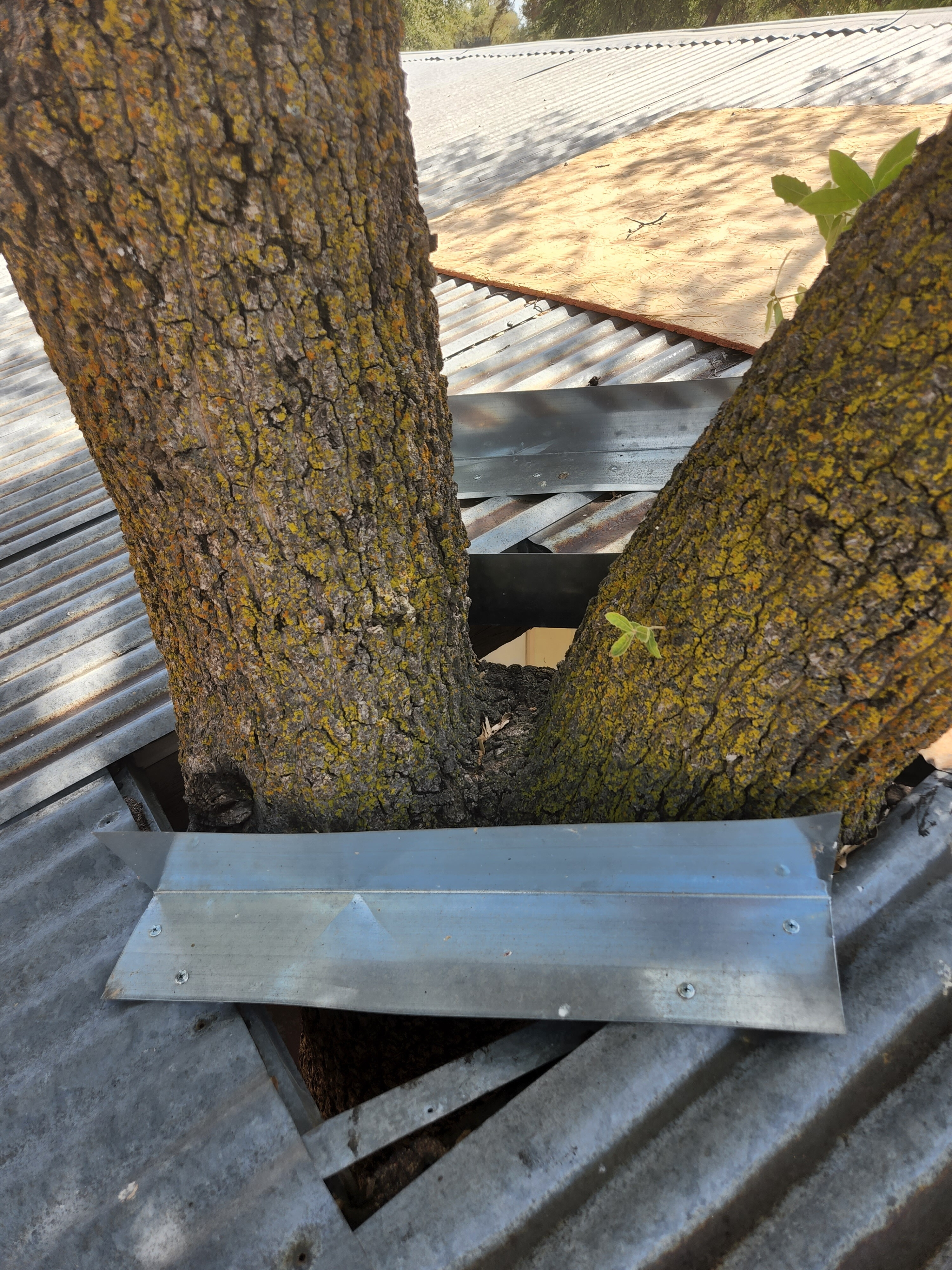 He might also try to plug the hole around the tree trunk at the roof with some of that aerosol styrofoam that comes in a can. That works well to fill in oddly-shaped openings.