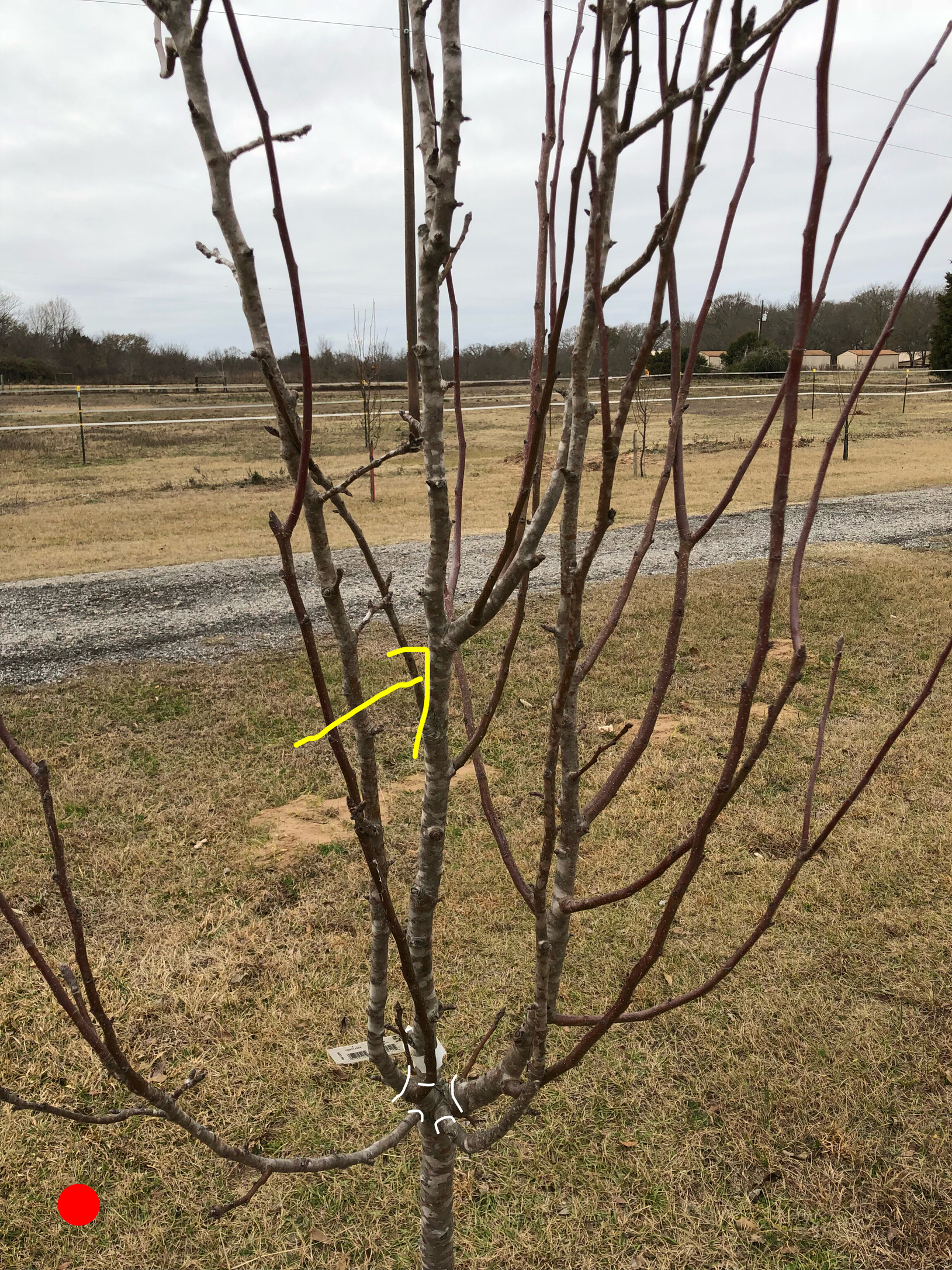 Well…I feel like I’m taking over the thread…I have gone back and read the other thread on pruning that you linked to and that does help. Here is a close up, better picture of the back of that tree where all those branches come off. A small one actually goes almost 90 degrees from the large branch going to back side of that tree. All of these branches come off at about the same place. The largest one coming off is going to take much of that dense upright growth with it when it comes off. I’ve also marked the lowest branching that will be left when I take the other off. It’s way on up there. So will it send out branches for lower “scaffolds” that I would train and keep? Or is that marked branching going to be the lowest large branch that I get…it’s probably 4 to 4 1/2 feet from the ground.