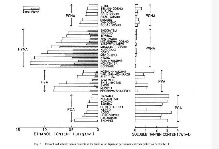 From this figure it would seem that flesh ethanol content is what’s important for distinguishing PC from PV cultivars. Seed ethanol content, while generally lower in PC than PV cultivars, has a good amount of overlap between categories. Some PVA cultivars with the same seed ethanol content as PVNA cultivars have very different flesh ethanol levels. Ethanol is highly soluble across cell walls. We can safely assume that any production in the seed quickly results in accumulation in the flesh. But different rates of ethanol metabolism in the flesh would help explain the distinctions between PCA/PVA/PVNA fruit.