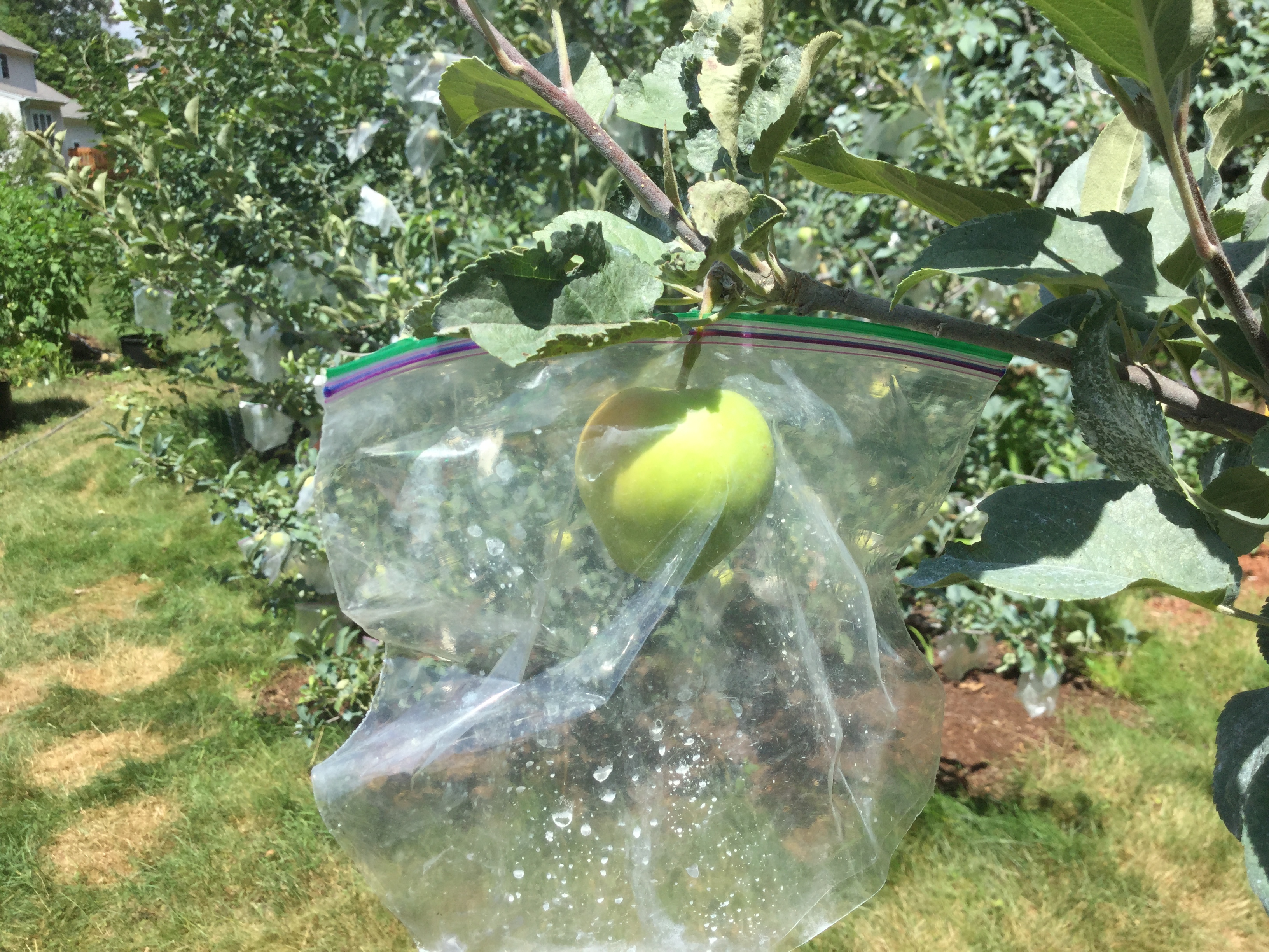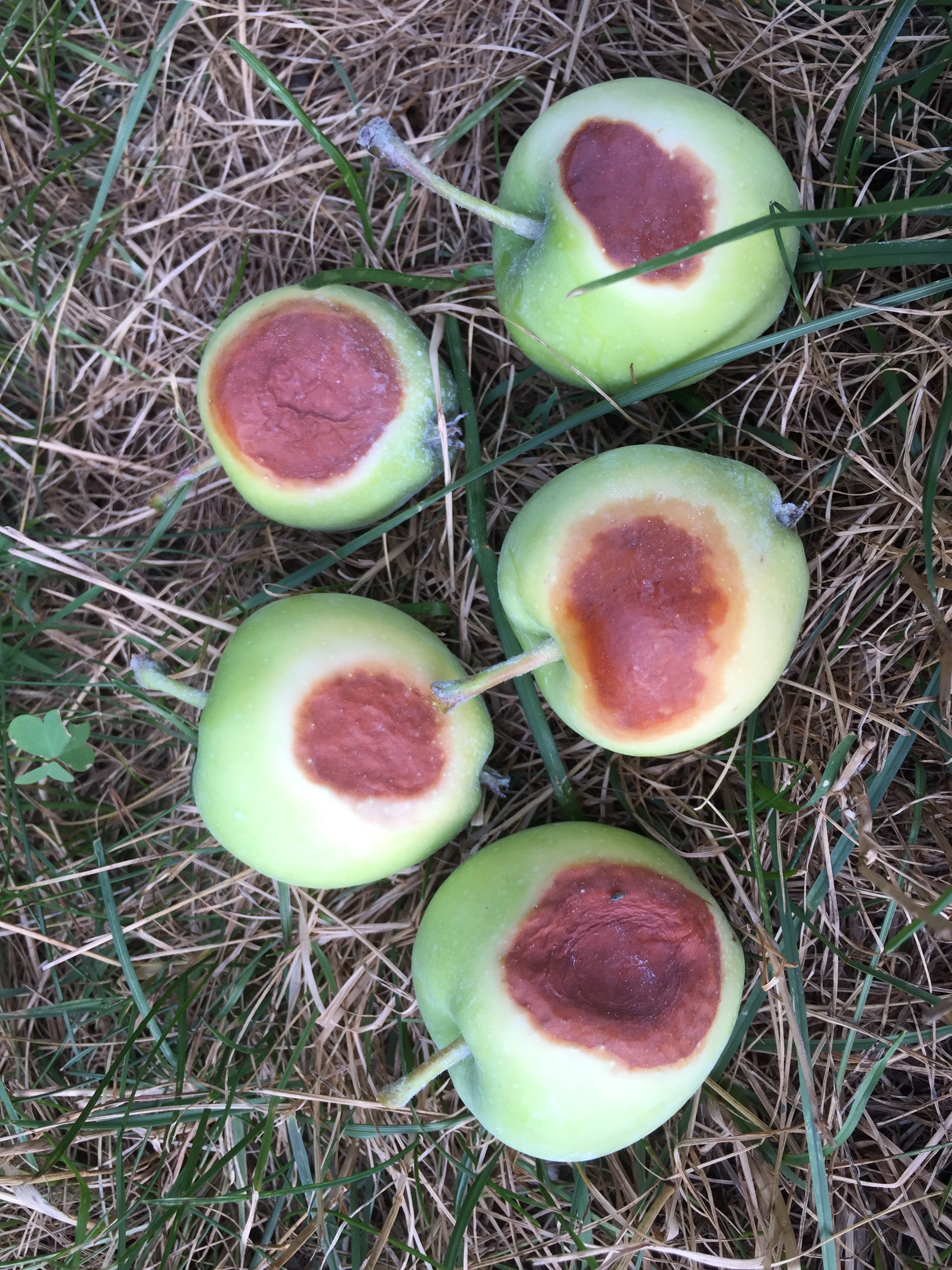 Today I saw some apples in bags got sun burned. This is the first time my bagged apples got it. Those burned spots are the area facing the sun.