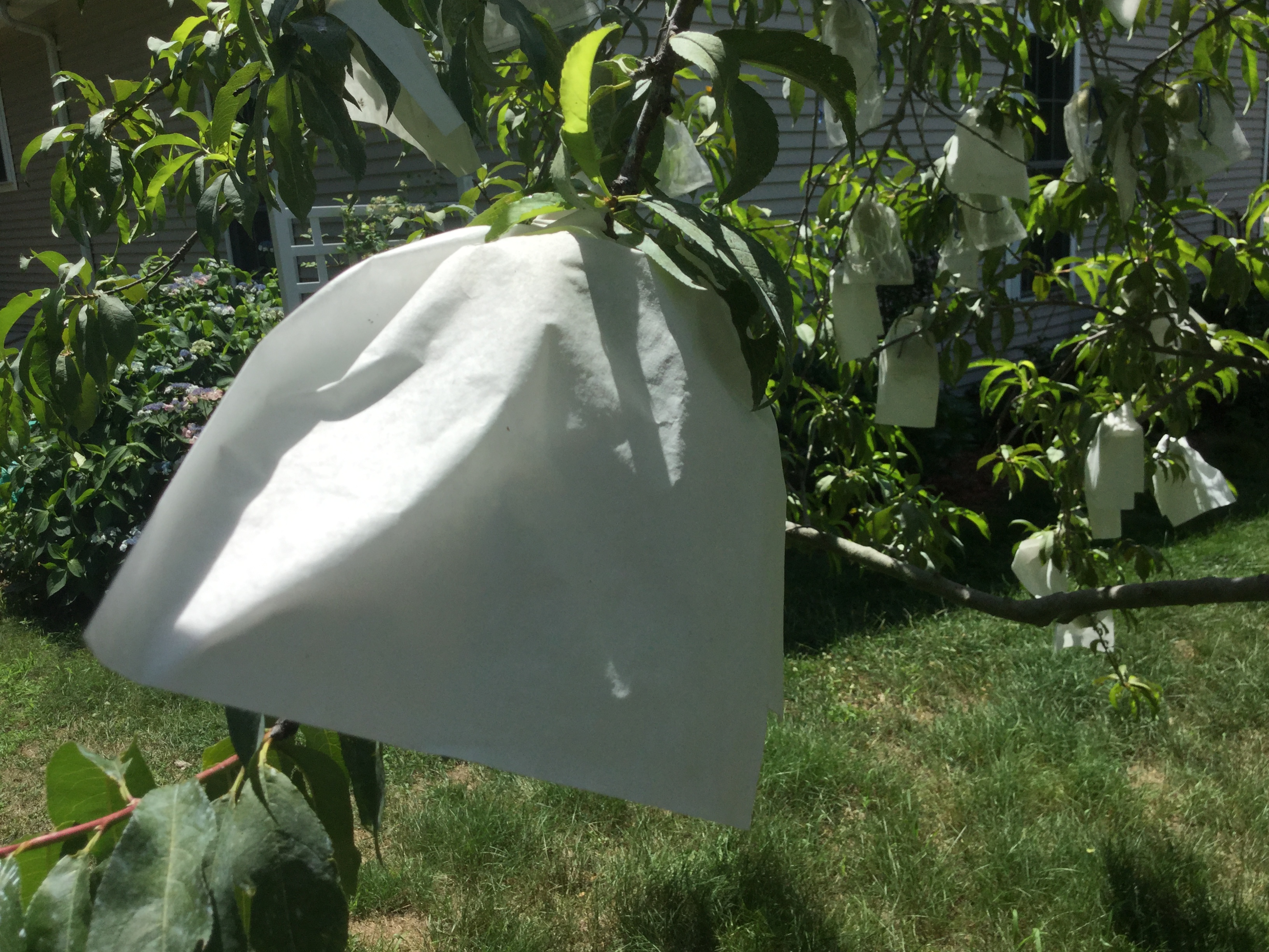 Peaches need max protection as their skin is so soft. Once pests lay eggs inside, most fruit will be ruined. Clemson paper bags or Japansese paper bags work very well if you apply to “clean” fruit when they are small. You need to spray peaches with insecticide (or Surround) and funcicide a couple of times including the day before you bag. If you do that and bag clean fruit, the ripened peaches are clean.