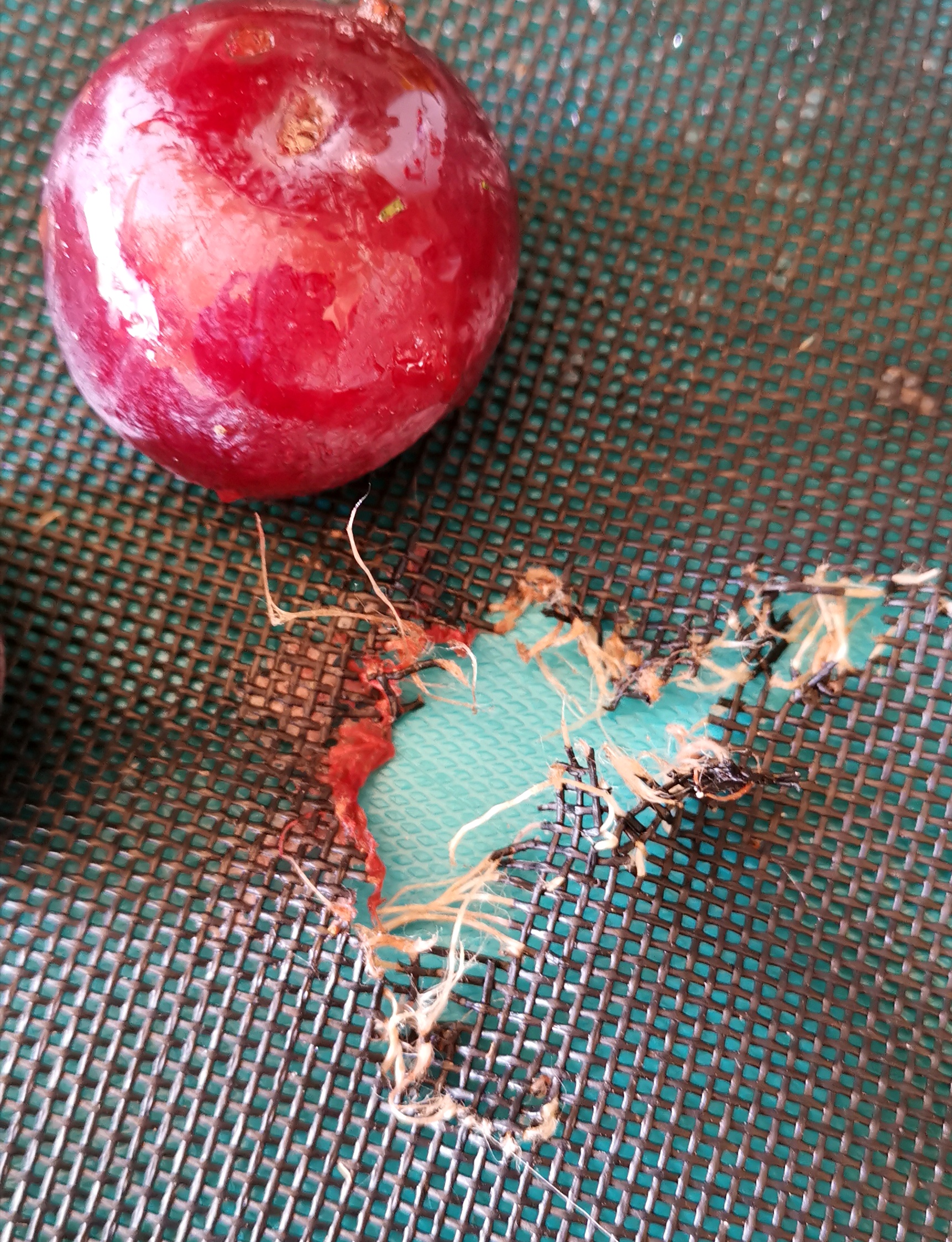 This is part of pet proof screen bag that was used to protect fruits on the tree. The fruits inside must taste very good for the squirrel to make such efforts to dig the fruits out .