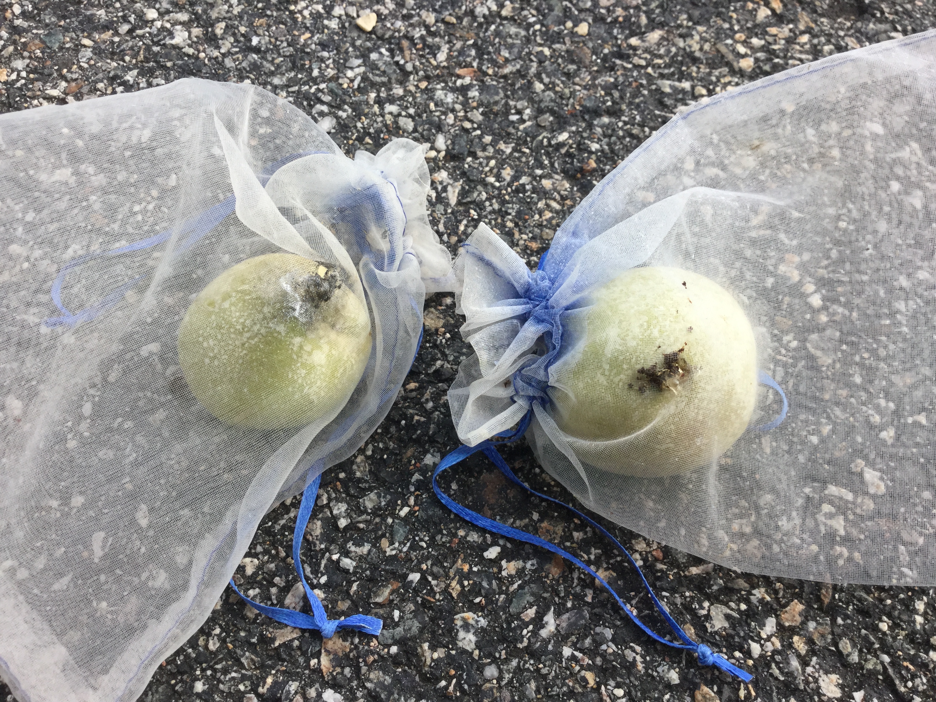 I do have a few apple trees with fruit this year. When I noticed a few apples missing, I stuck a metal pole in the ground next to the trunk, got out one of my tennis balls and cut an X on one side and pushed the cut X onto the top of the pole, threw my environmesh row cover over the pole, placed a few rocks around the bottom to hold the row cover down. So far so good.