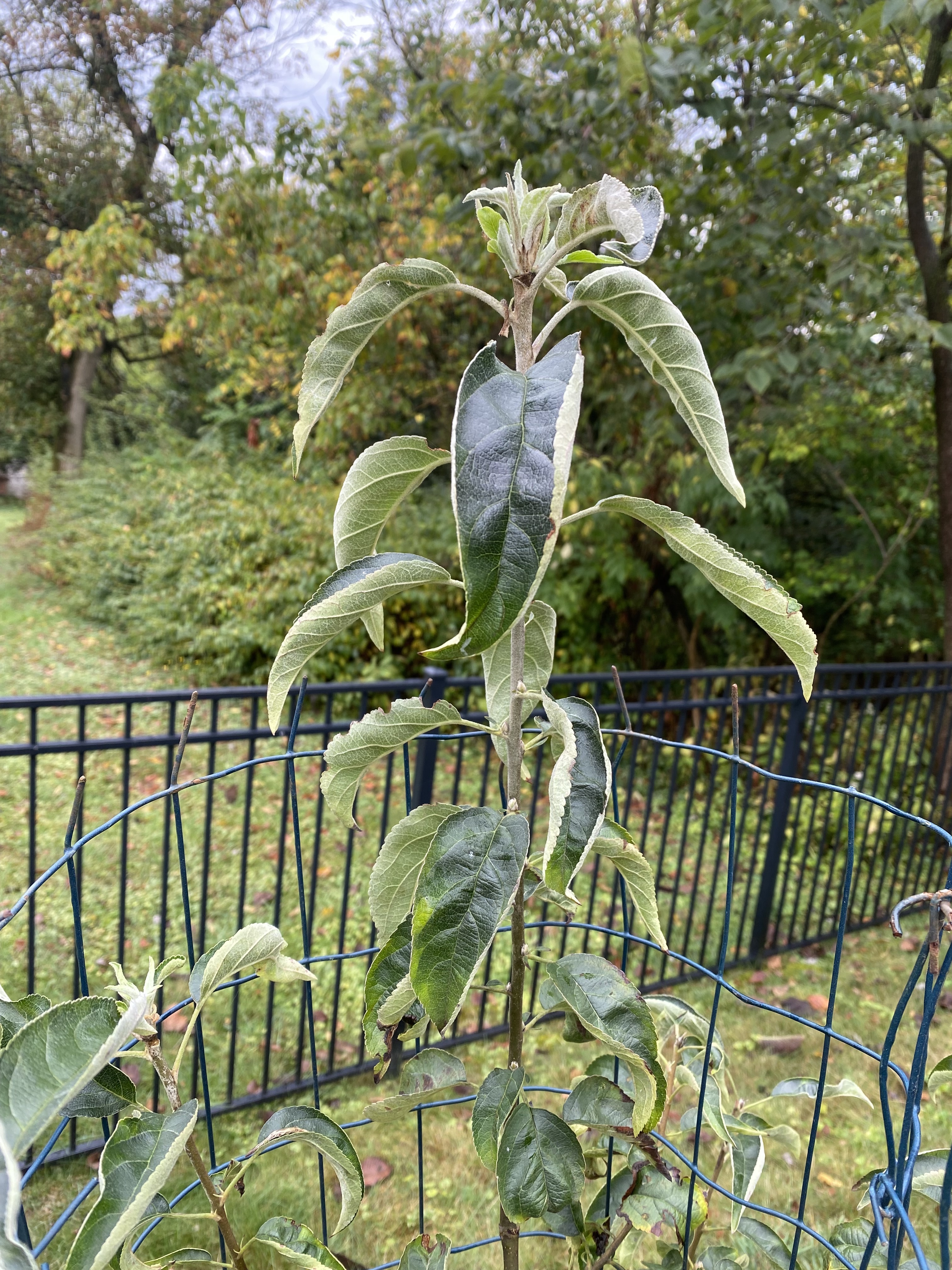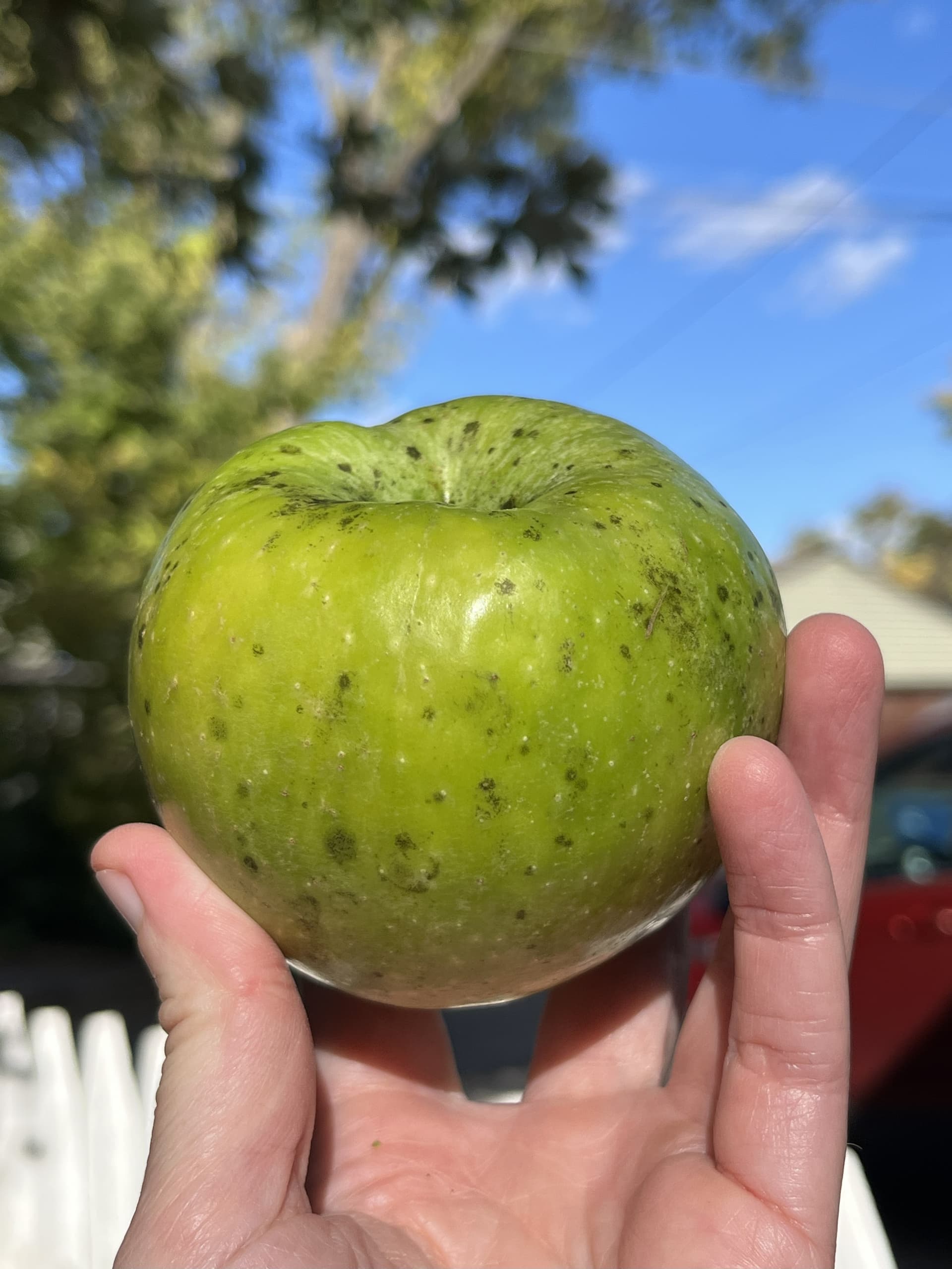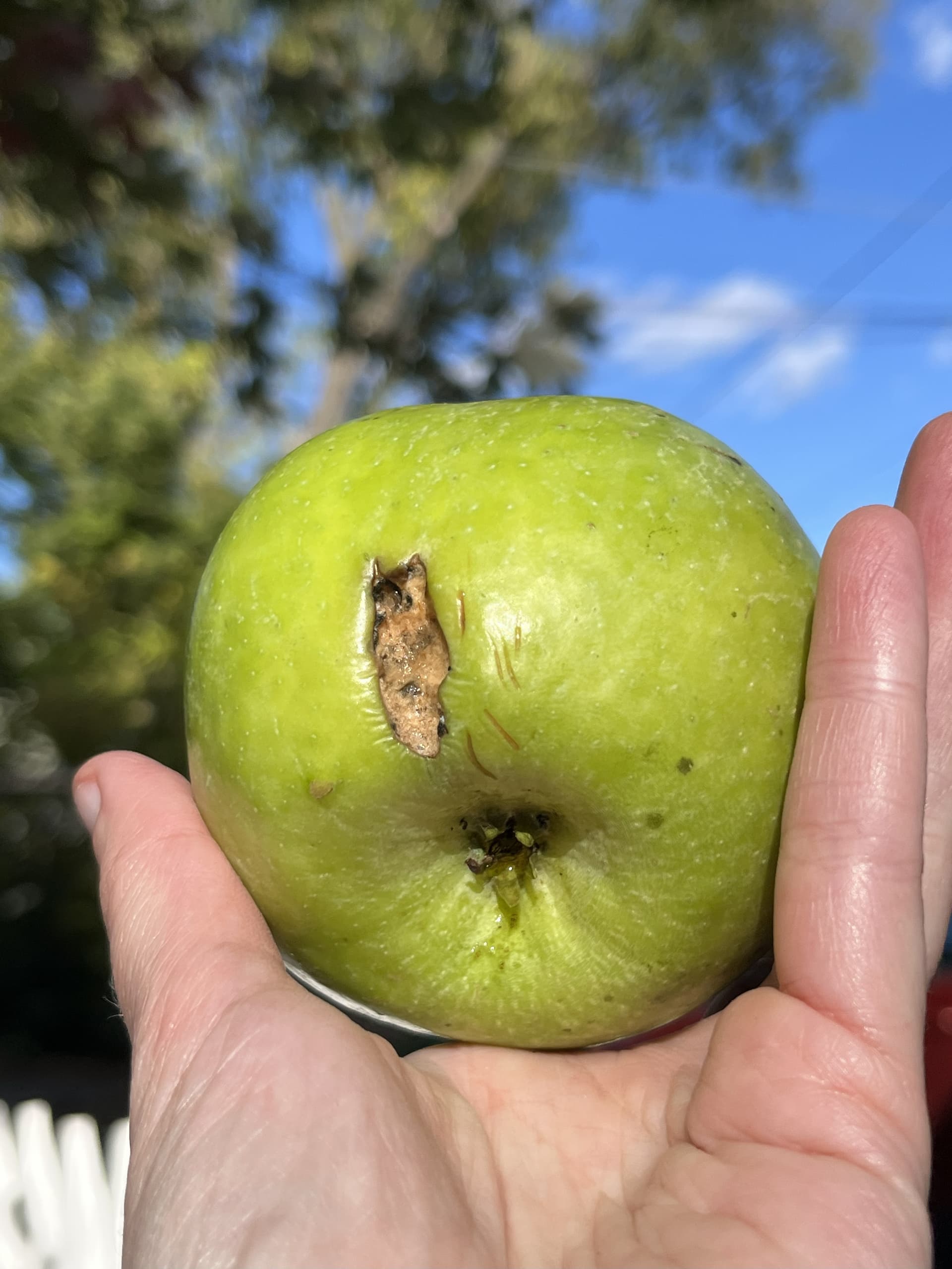 Sad to report that I accidentally twisted the apple off the stem in an attempt to examine it. Looks like something took a bite and decided it wasn’t tasty enough to keep going? It’s in the fridge now but I’m not sure it will last 2-3 months. I might have to sample it “green”. Fingers crossed I’ll have more to taste next year.