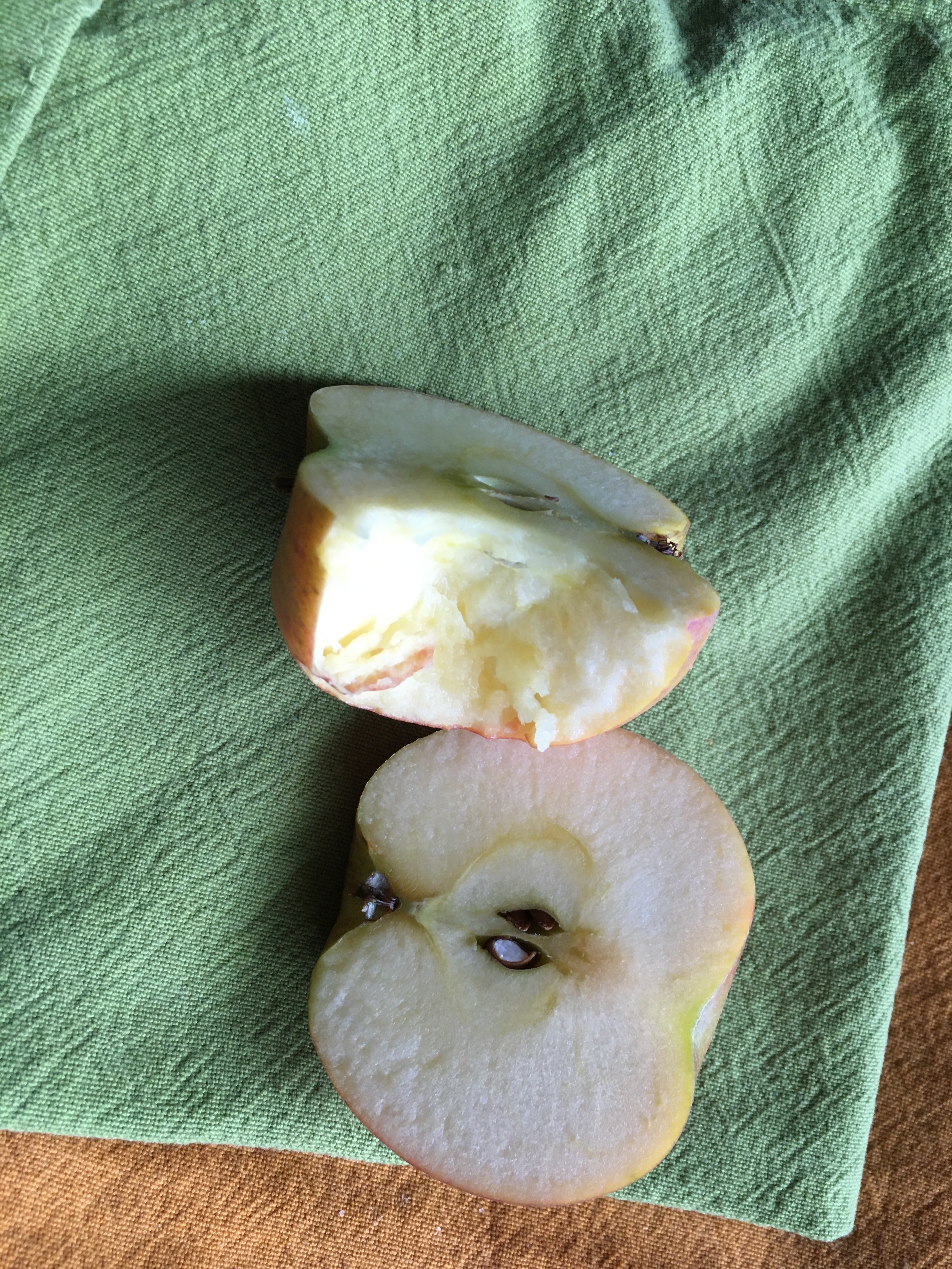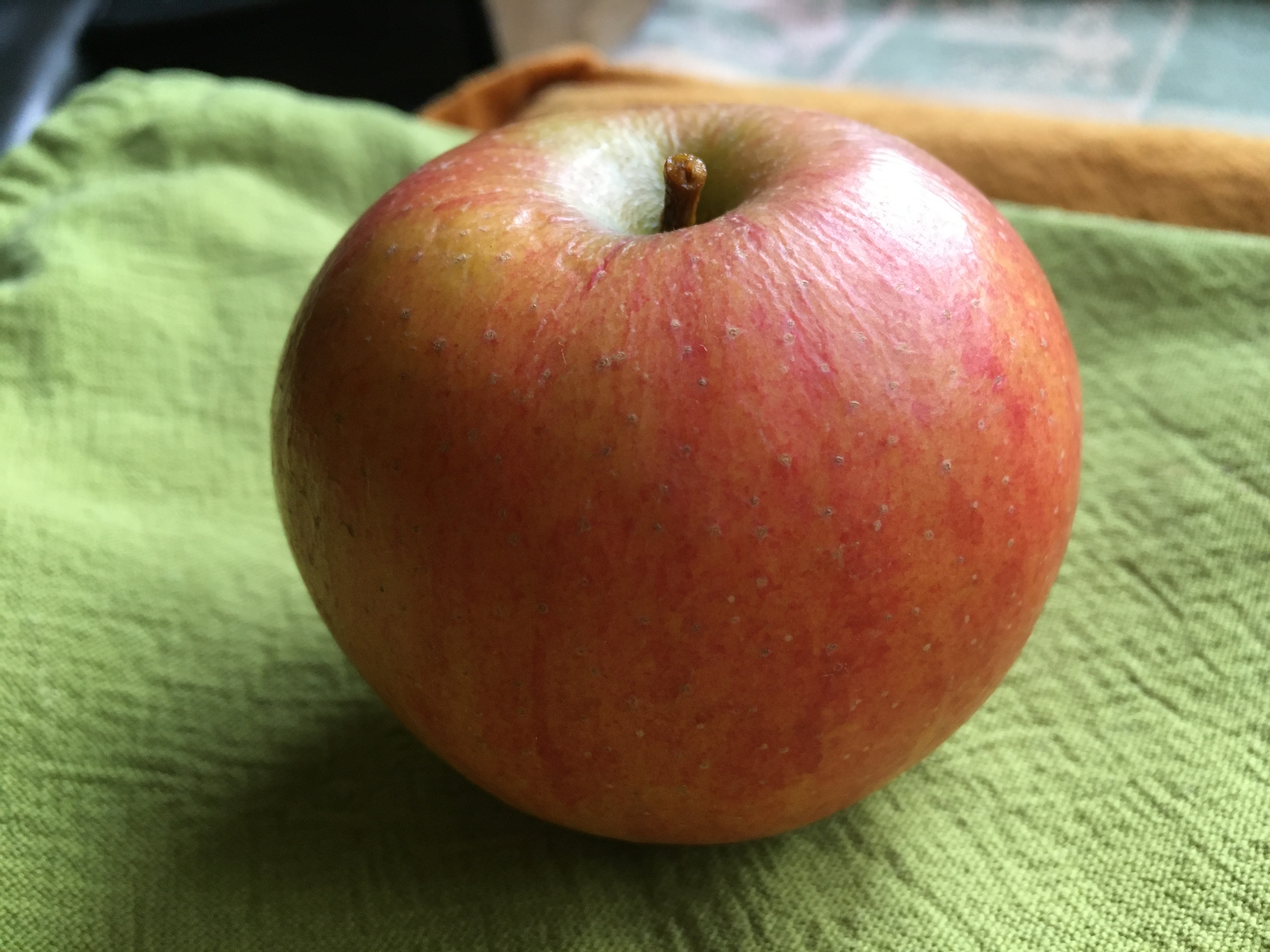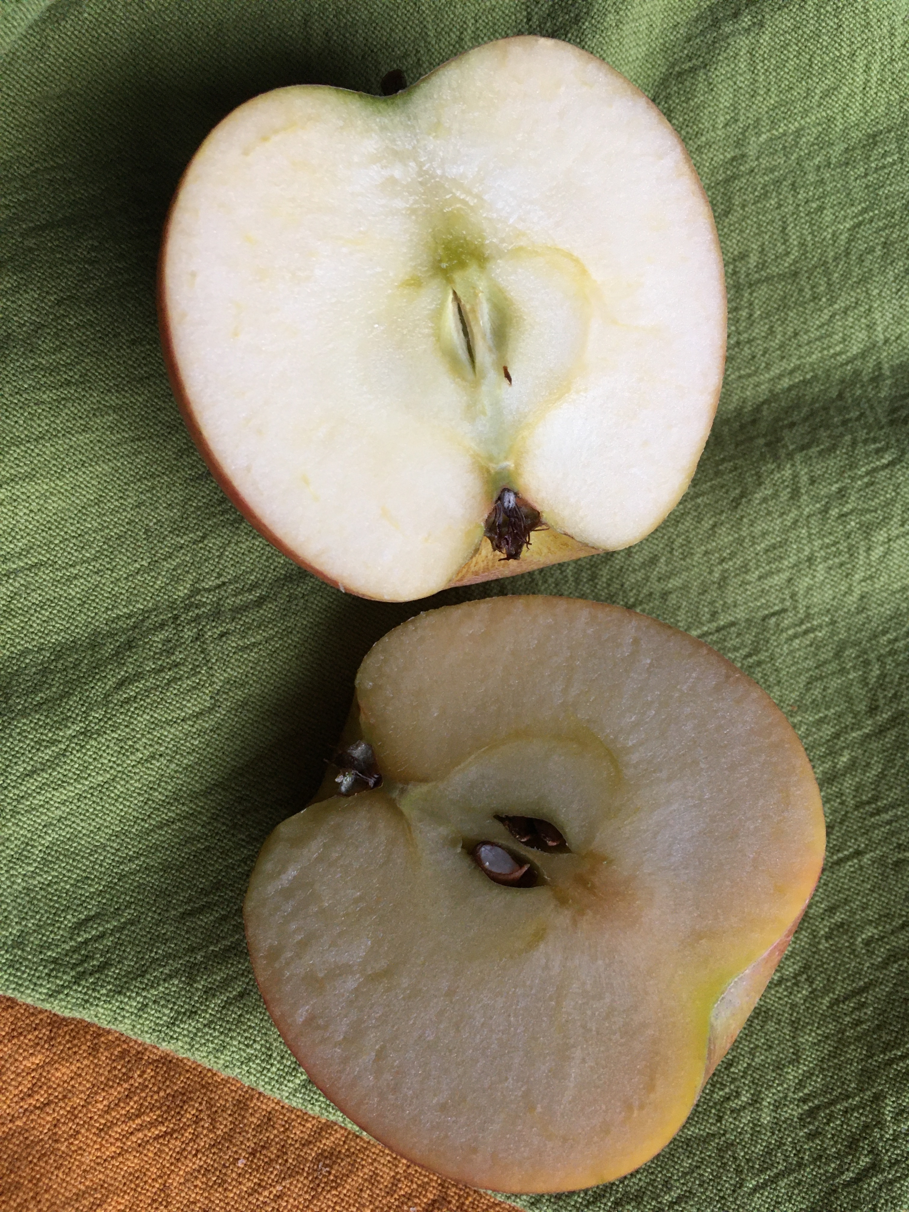 Last fall in the rush of getting my apples off the tree and bagged ahead of a nasty cold wave I left this one sitting in a plastic tub outside in the unheated garage. Since then we’ve had lows into the teens two or three times and highs into the low forties. I kept glancing at that apple thinking it should be mush, but it looked so good I decided to bring it in and cut it open. Gave it an hour to warm a bit and cut it open. It wasn’t perfect but it was really good. Still had lots of excellent Cox-or-Kidd’s-like flavor, sharp/sweet balance, not very mealy but just a bit, juicy still. Obviously a little shrivelled, but then, who wouldn’t be?