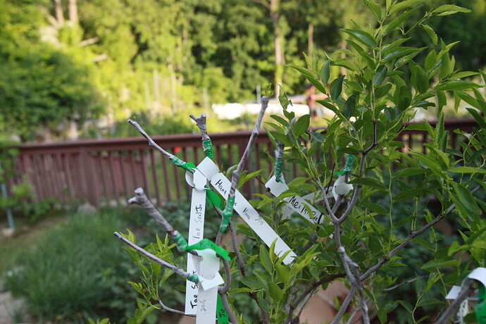 So, given the lack of takes on the new rootstocks, I grafted quite a few scions onto my 3 existing in-ground trees. Two of the trees are too small to take more than a couple grafts, but the 3rd (a 4th year So) received 25 grafts of 20 varieties.
