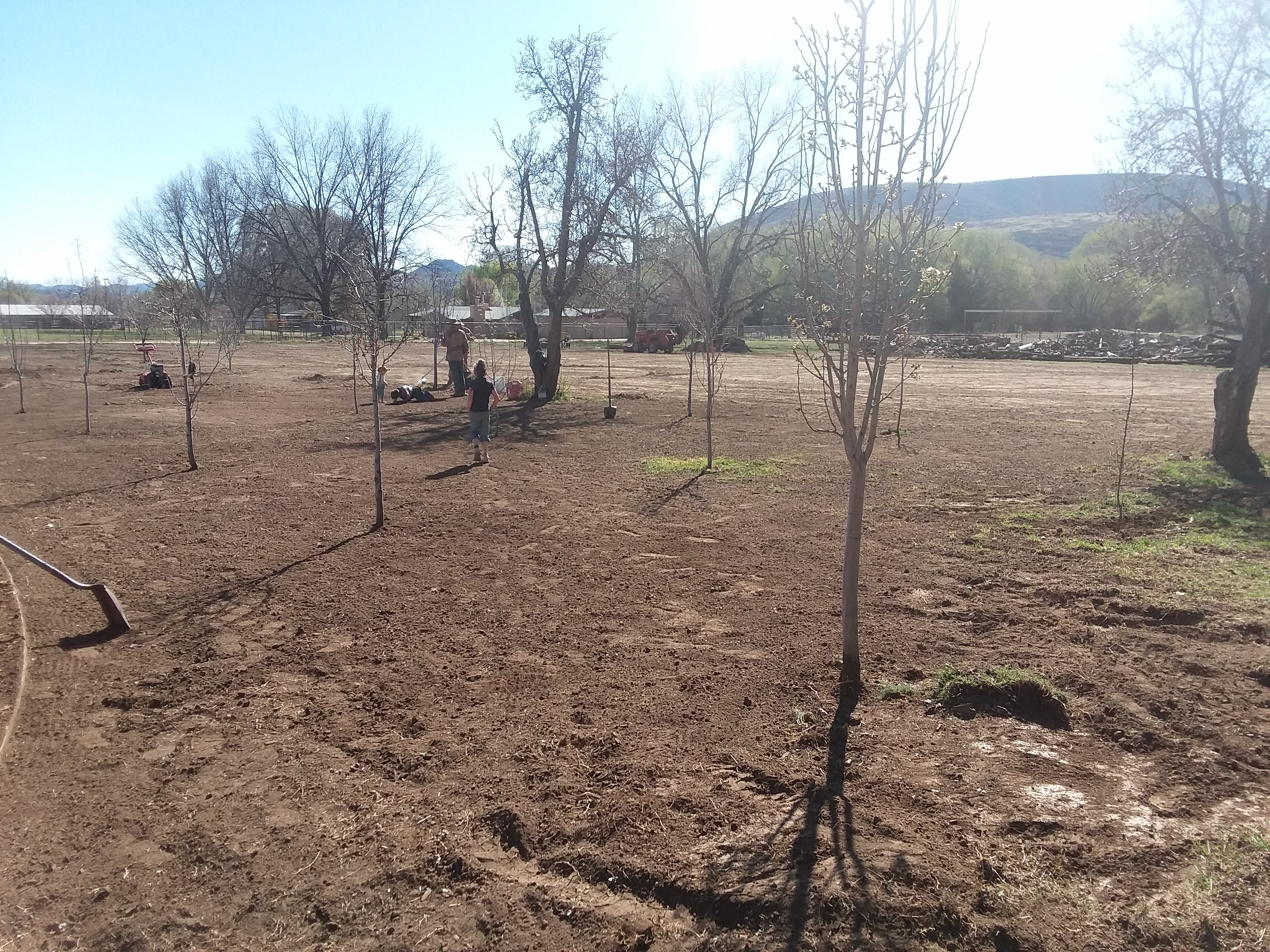Rain fall varries. We have a dry season before summer rains every year that makes irrigation a must. That is what we are doing today, leveling the ground around the pear and cherry trees prepping for putting in sprinklers.