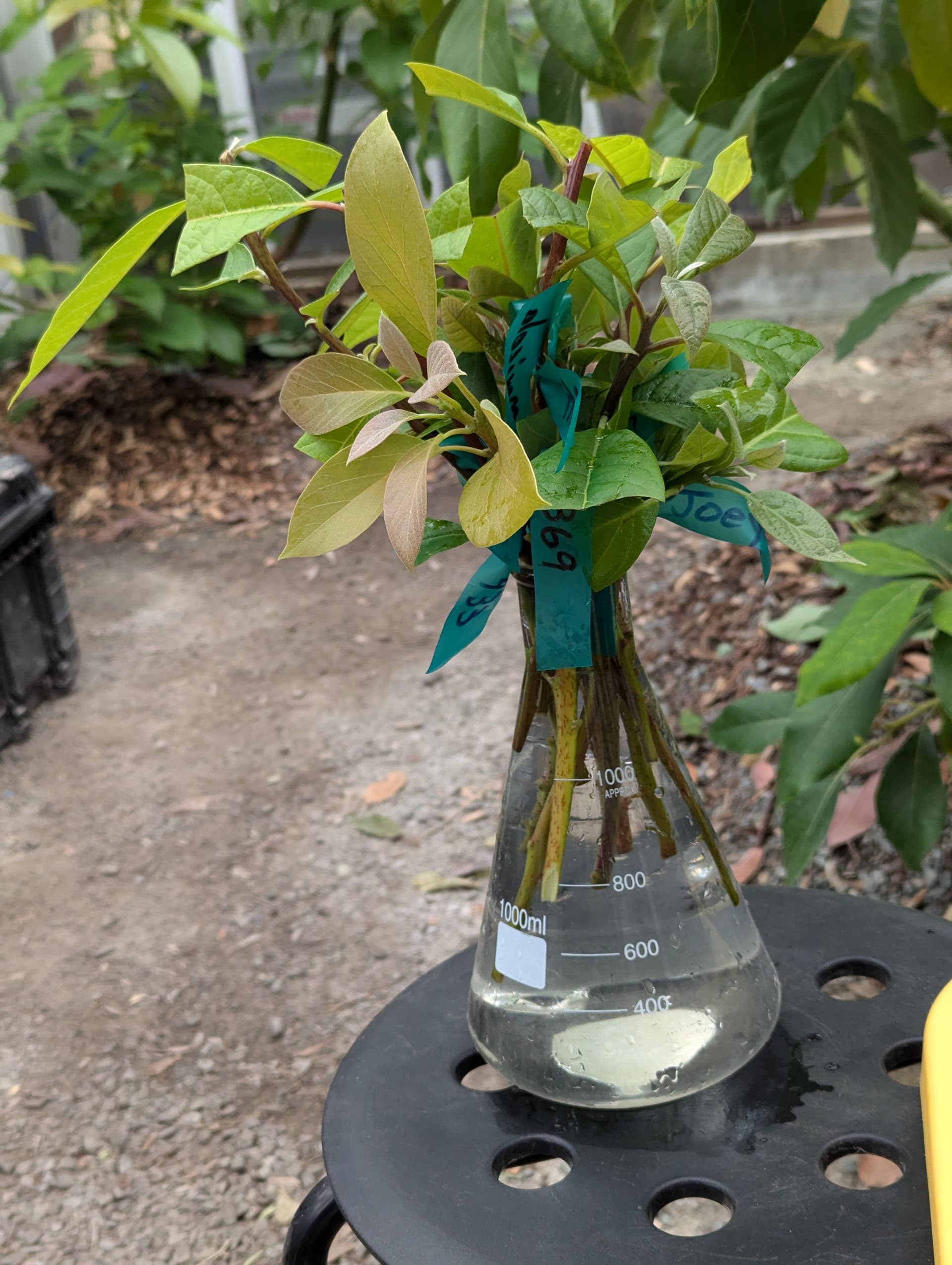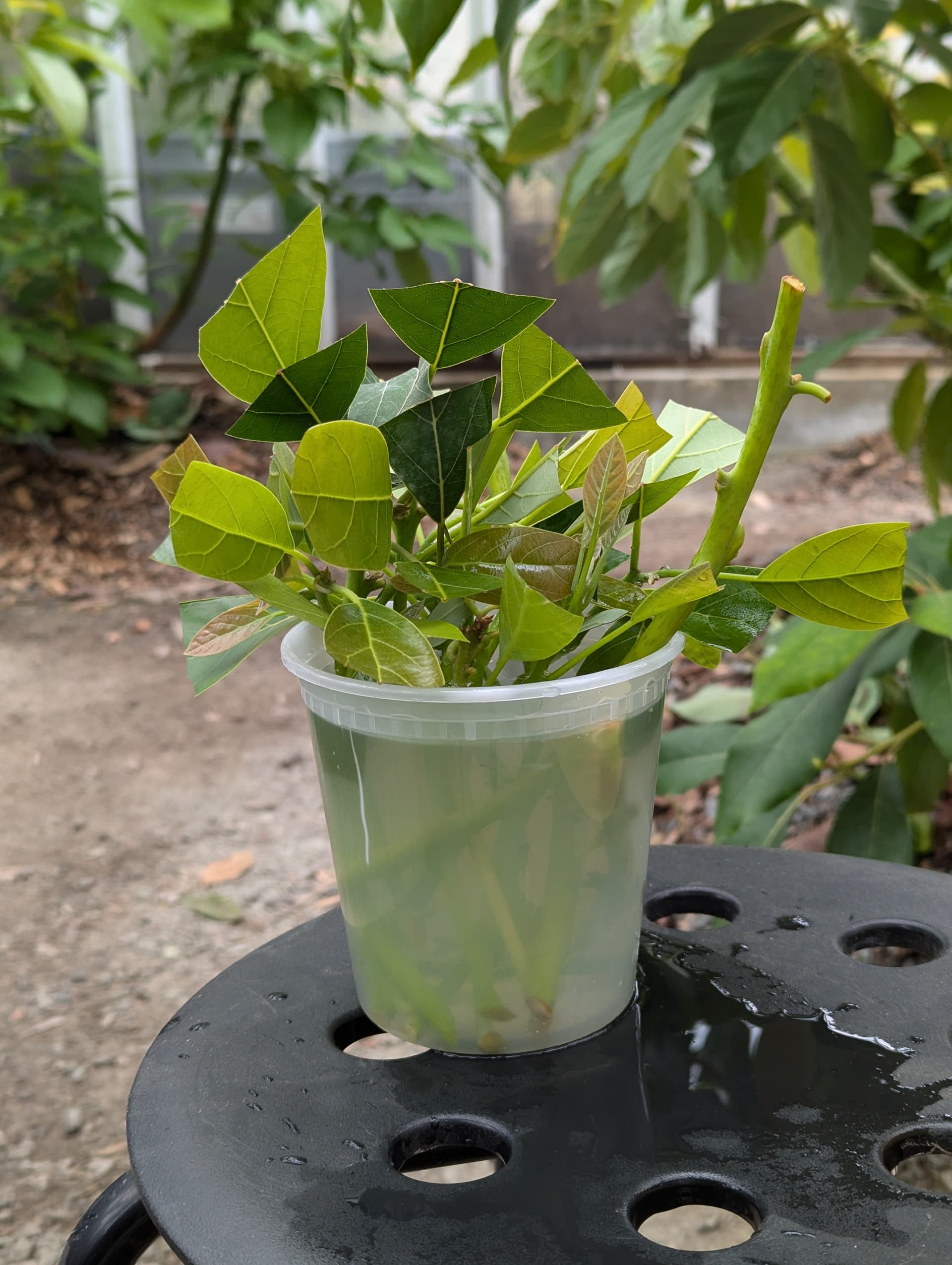Here’s my vase of misc avocado cuttings I’ve set aside to callus, mostly from seedling rootstocks when I grafted them, but also a few named varieties that I haven’t rooted yet: