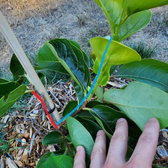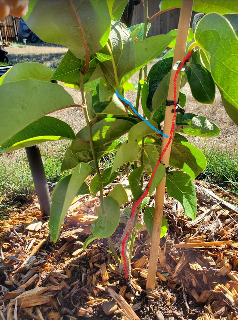 I have this little guy, about 1.5ft tall, who appears to have abandoned its central leader (red). This is our first summer with it, and when we got it, all it had was the red stem. This season it has produced everything else, and especially the blue one looks like it is trying to be the new leader but it’s growing at an odd angle. It’s not very clear in the photo (I can only attach 1 photo as a new user) but it reaches several inches higher than the red branch.