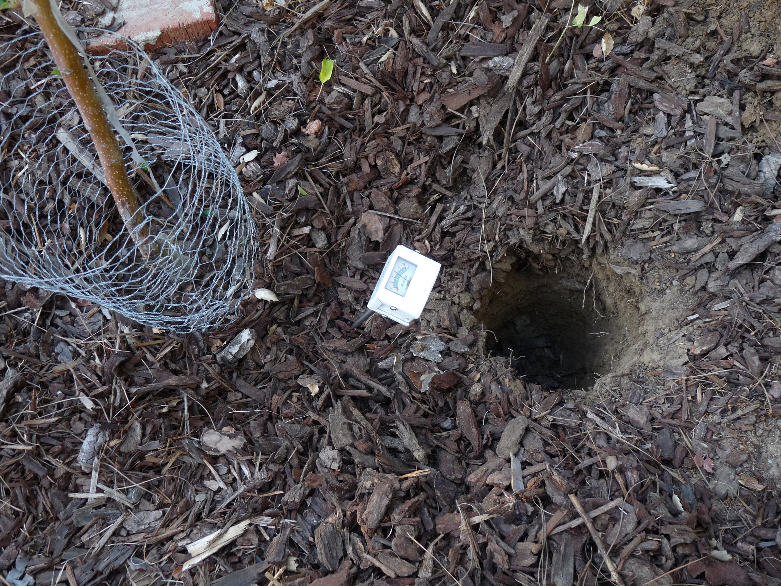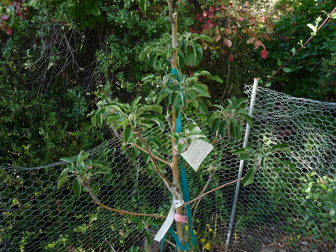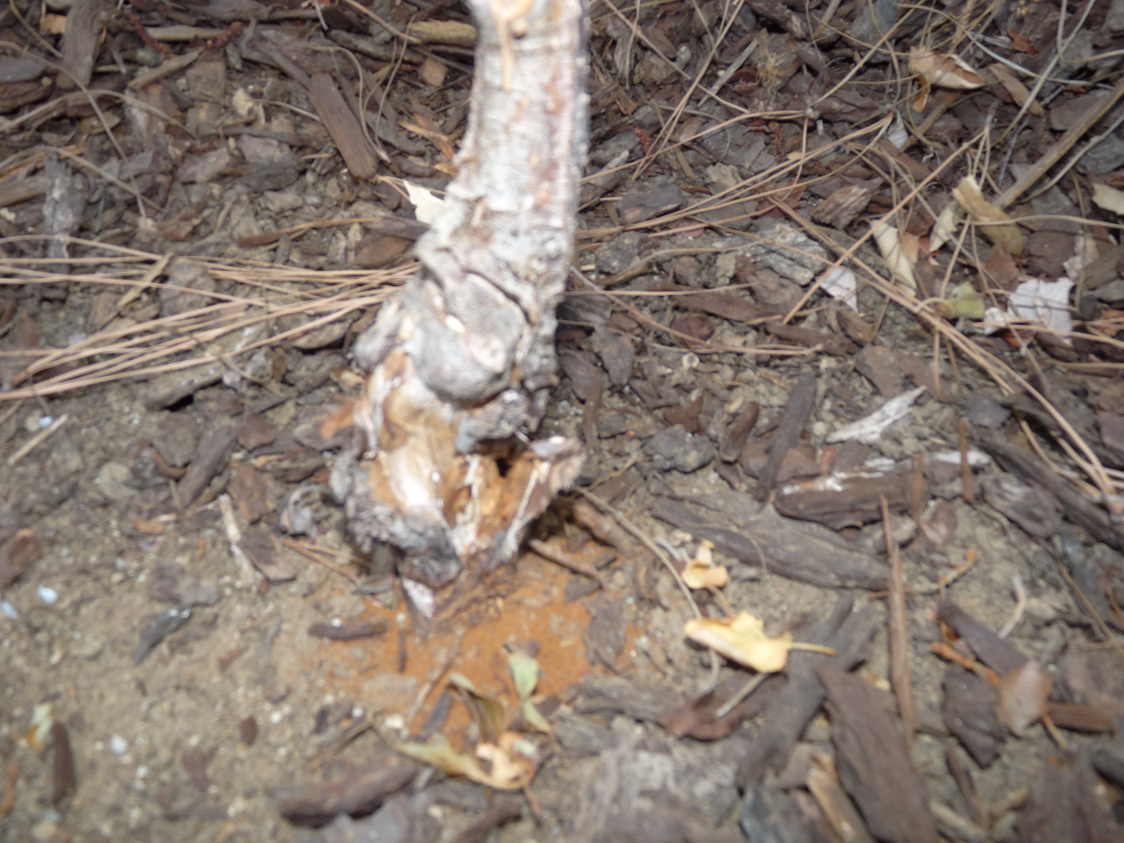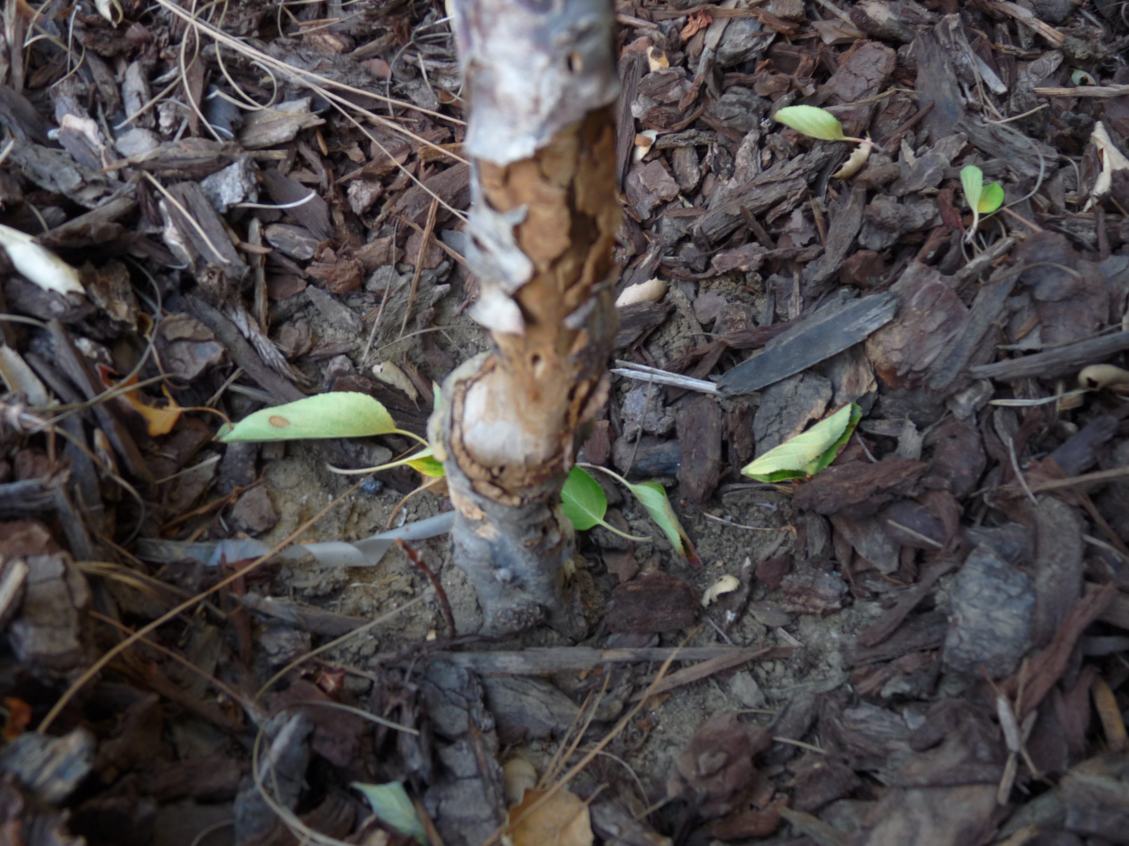 I thought it might be from watering, and the trees are surrounded by bark mulch…but I have chicken wire cylinders(6" diameter) around the base so I don’t think there was much contact from the wet bark. The trees are inside some deer fencing plus surrounded by chicken wire (4 ft high) plus with the mentioned 6" cylinders around the trunk, so I doubt that this was caused by an animal…and it doesn’t look like that anyways.