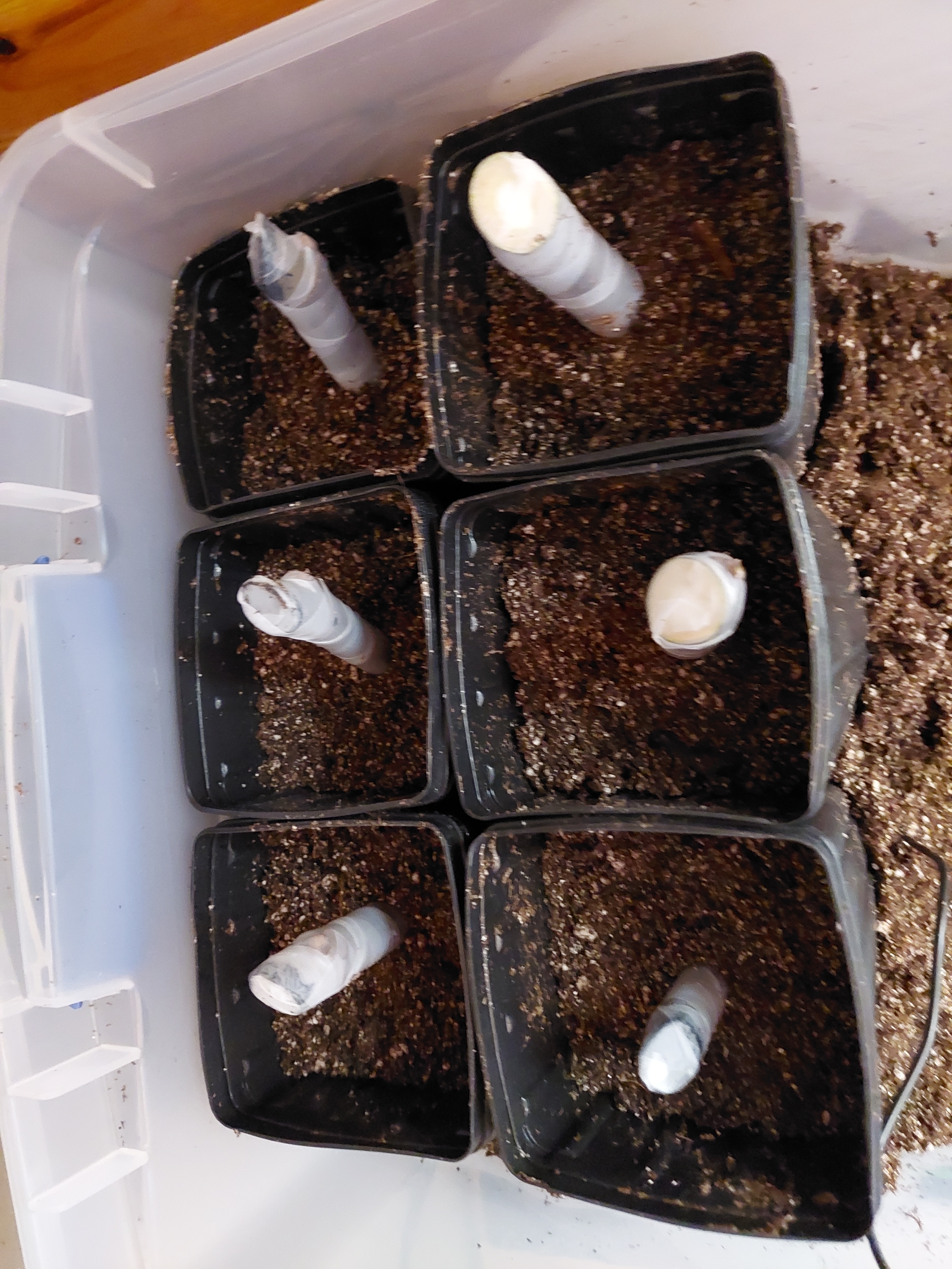 My temperature probe for the thermostat… I have it stuck in the medium between the pots at the level I would expect roots to develop. I have the above medium part of the fig cutting wrapped in parafilm.
