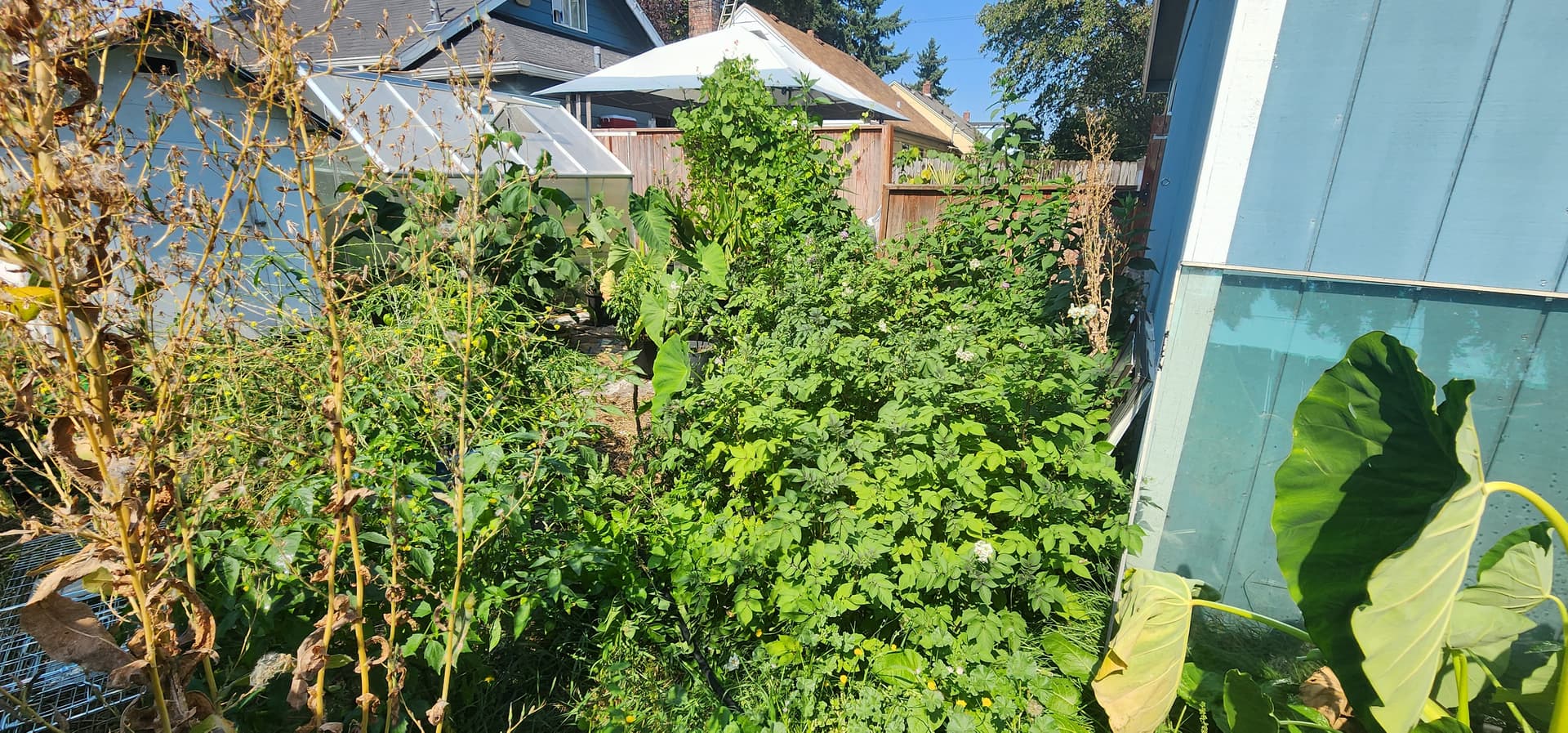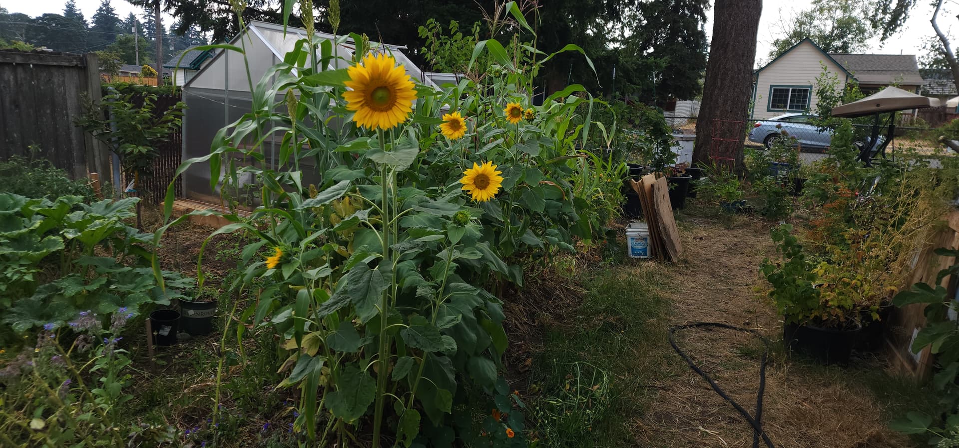 Unfortunately, my dense planting schemes and the planned fence are making it more challenging to get a wheel barrow from the driveway to one side of the backyard, though still possible. The only area that should remain to mow is on the backyard side where the mower is kept.