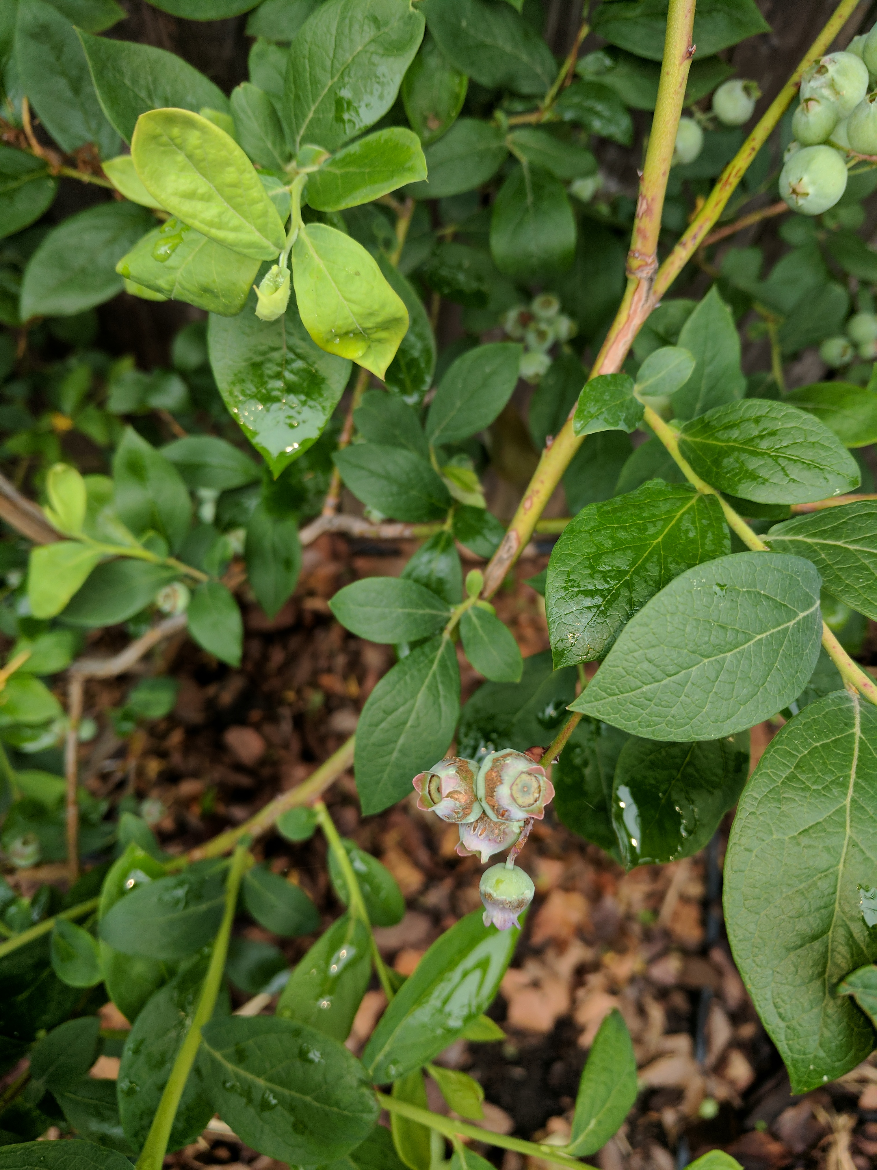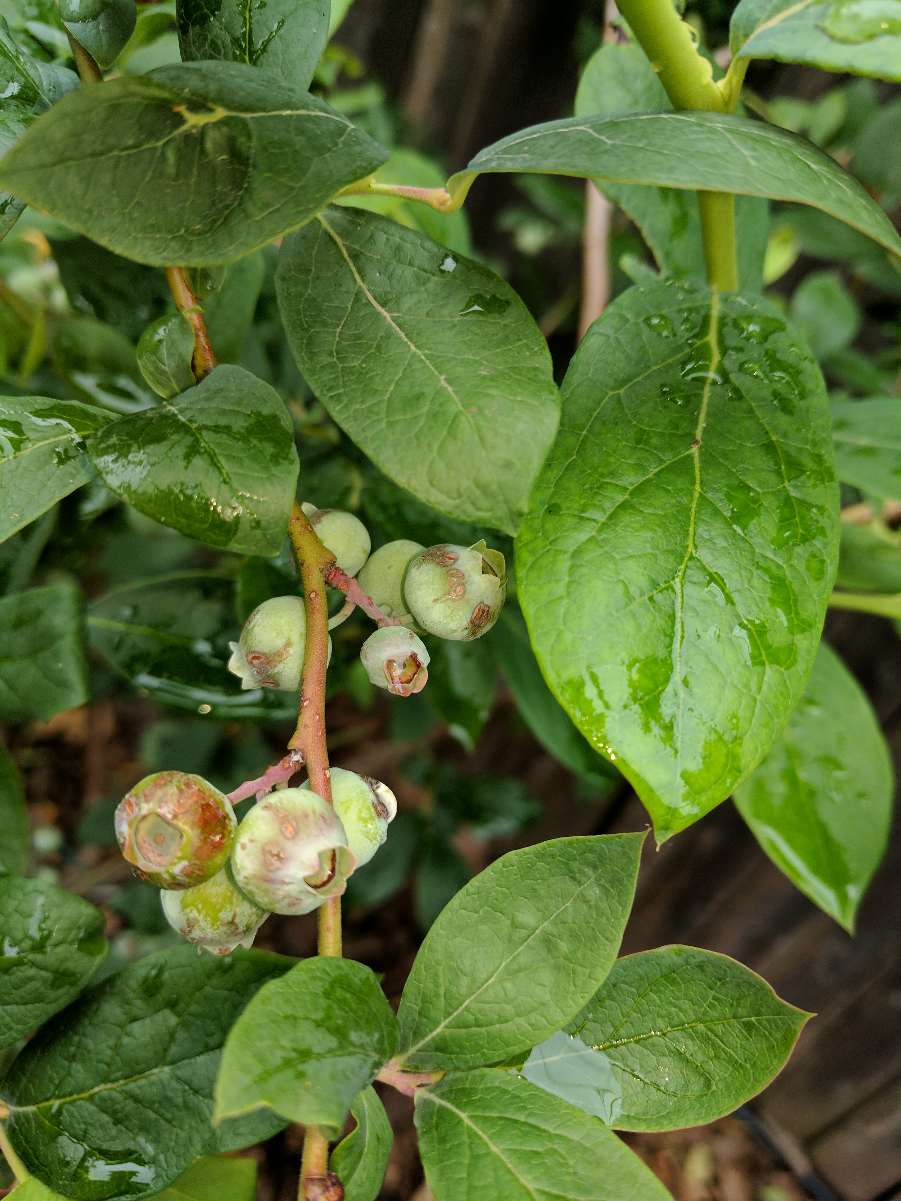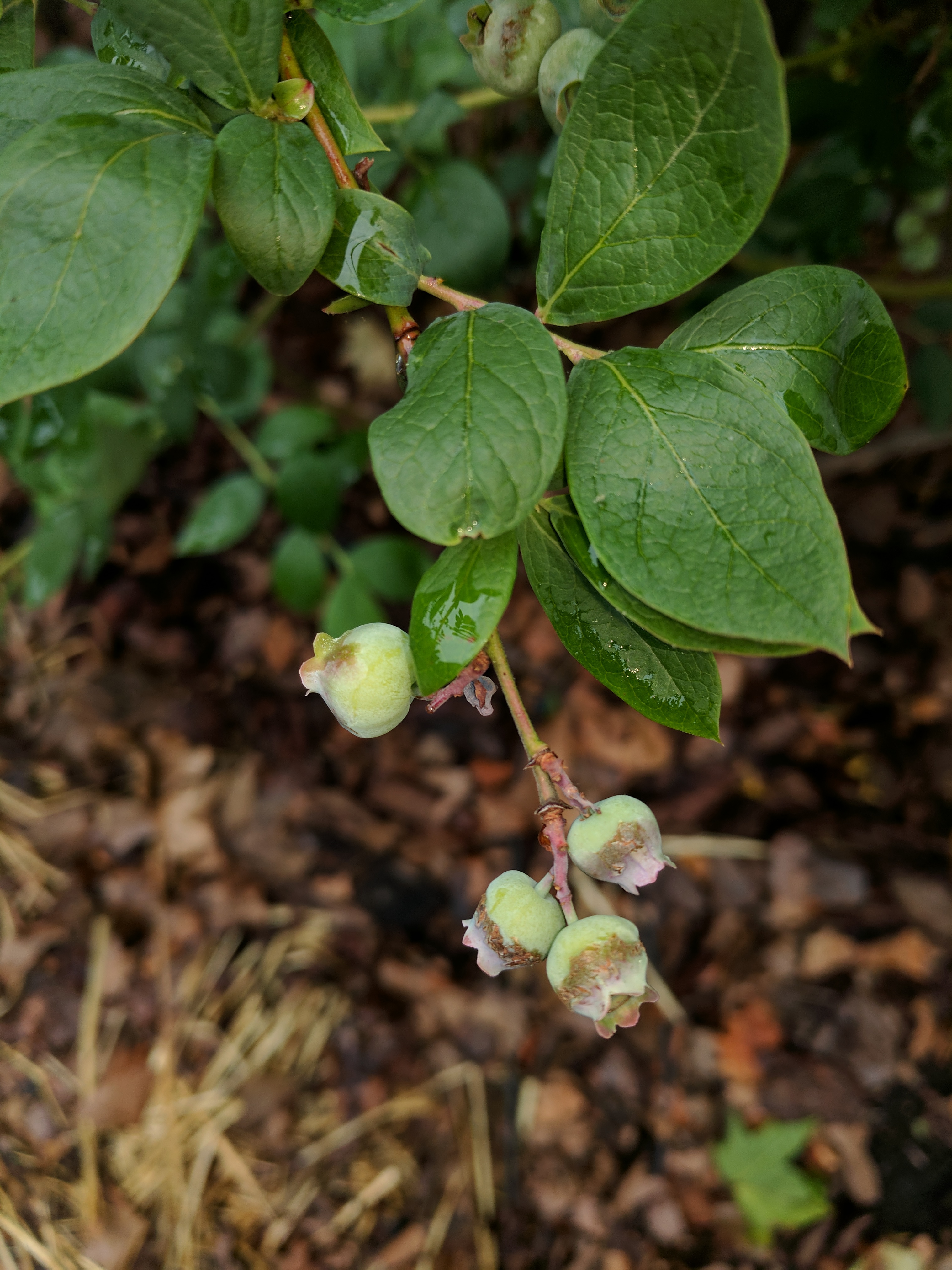 I’m not sure that I can say either of mine have long gangly canes. While both are healthy one has definitely grown better than the other. The smaller plant with larger berries had them totally stripped by some animal. I assume birds. The larger bush is ripening later and unless I cover it I probably won’t get many berries from it either. I never had anything touch blueberries at my old house but here in the newer one I’ve had them hit both years.