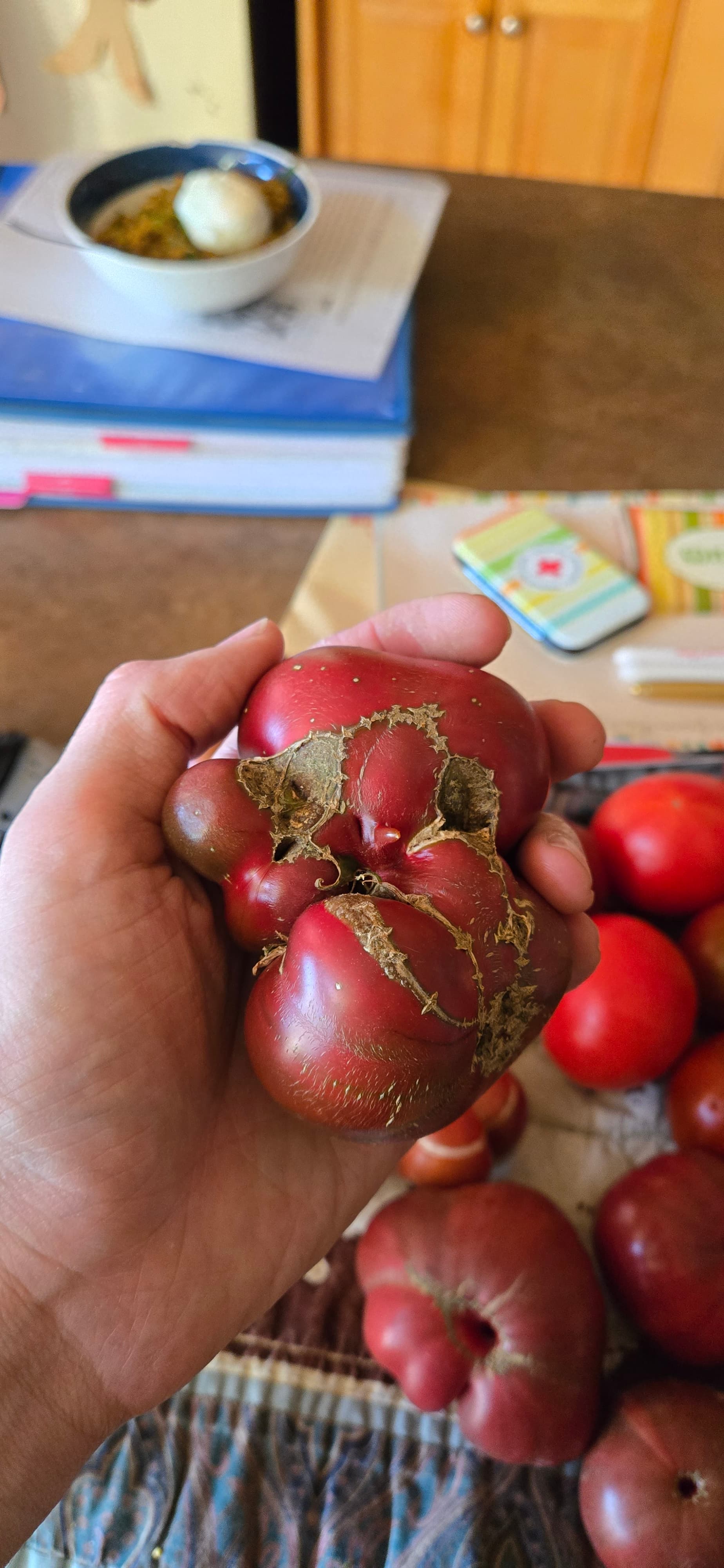 I had some pretty horrifying tomatoes this summer. They looked like a surgery experiment gone wrong.