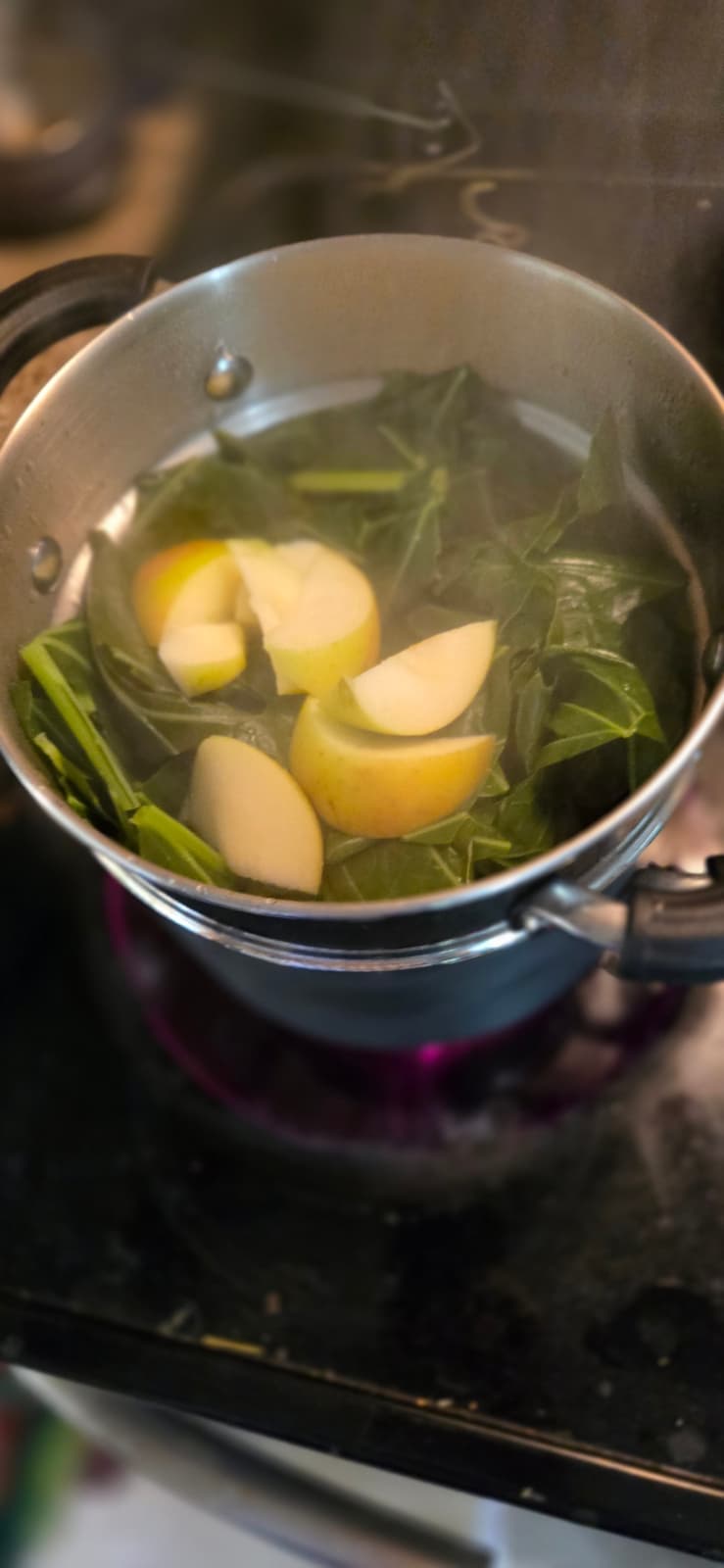 I had seen recipes with cooking apples with collards but never tried it. While waiting for the collards to cook, I started eating a very ripe Smokehouse apple that was nice and sweet. I decided to throw in some some slices in the last five minutes of steaming.