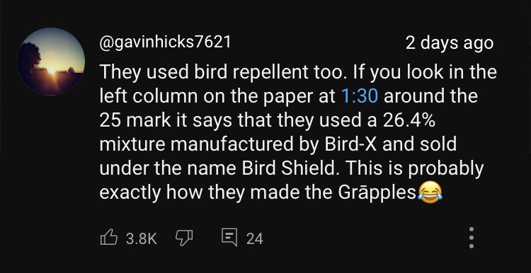 One eagle-eyed viewer took a closer look at the patent on the screen, and noticed they too used bird repellent in their recipe.