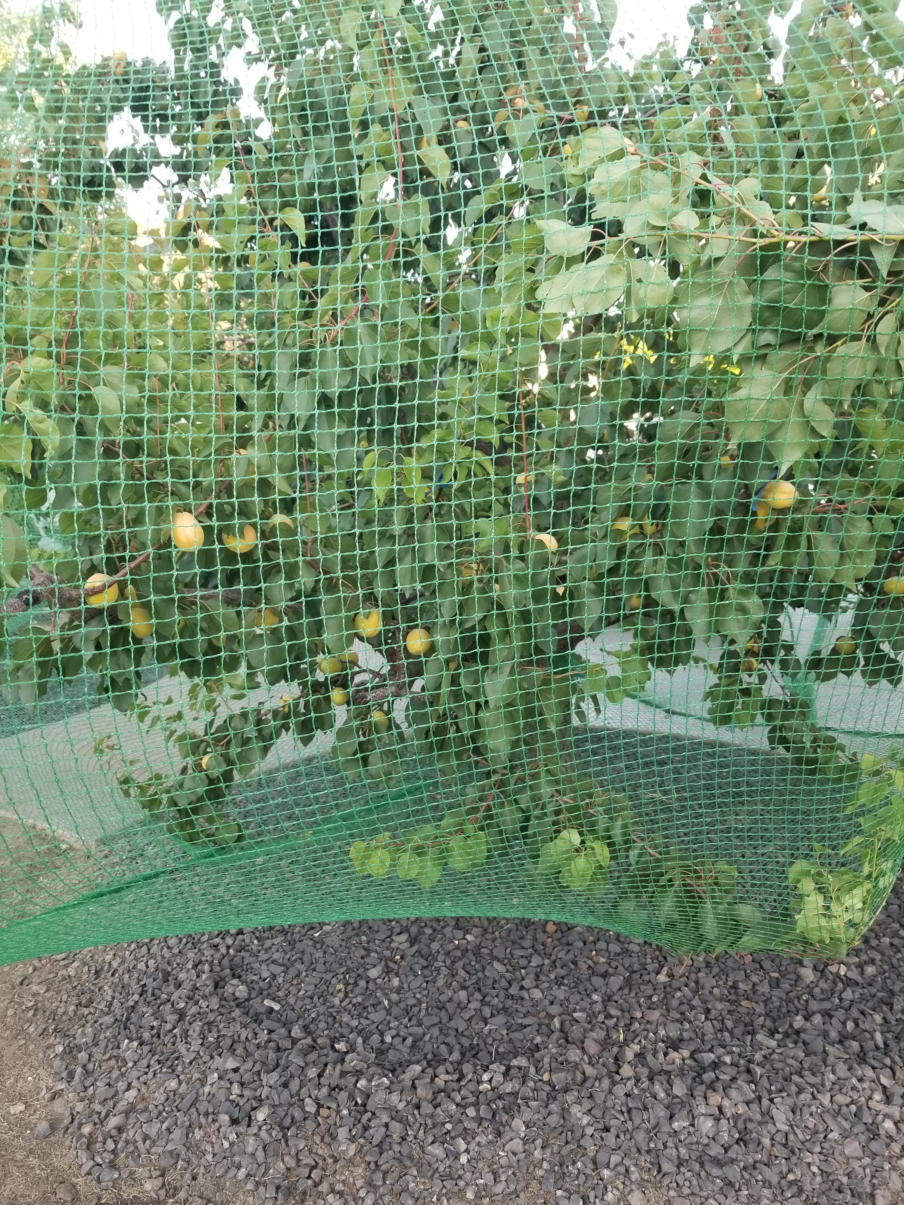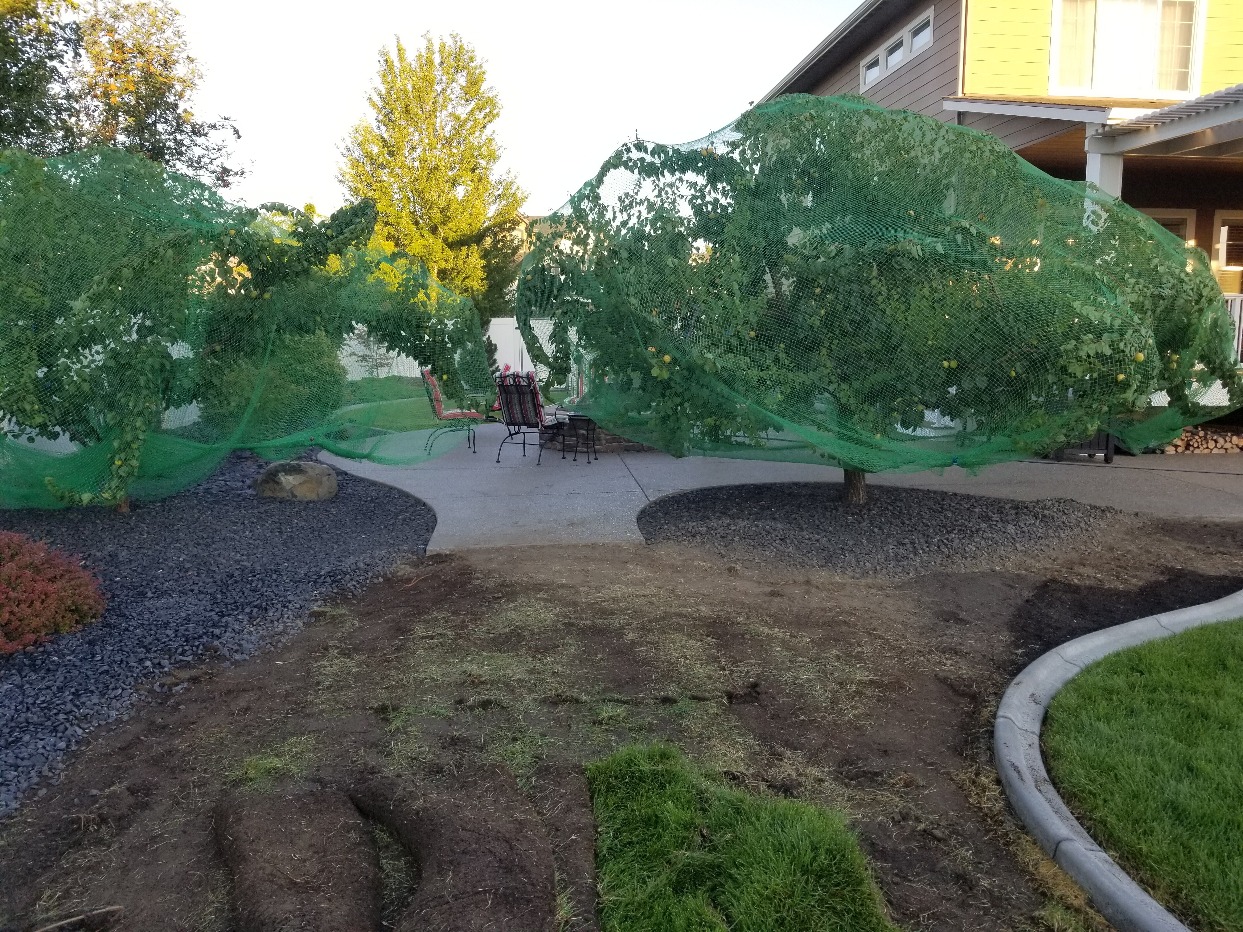 Good news is I got the bird netting really tight, with no holes this year, so no fruit hit the ground. Here are the first 3 fruits, 2 Shalah, and 1 Orangered.