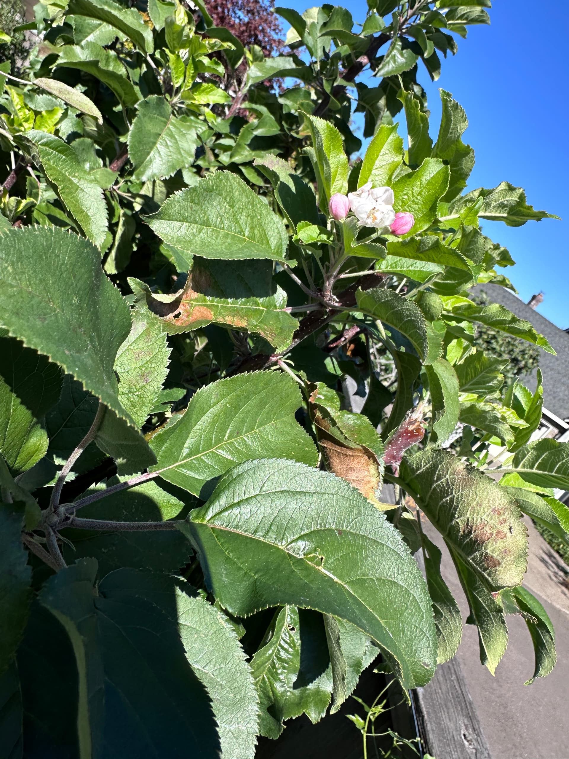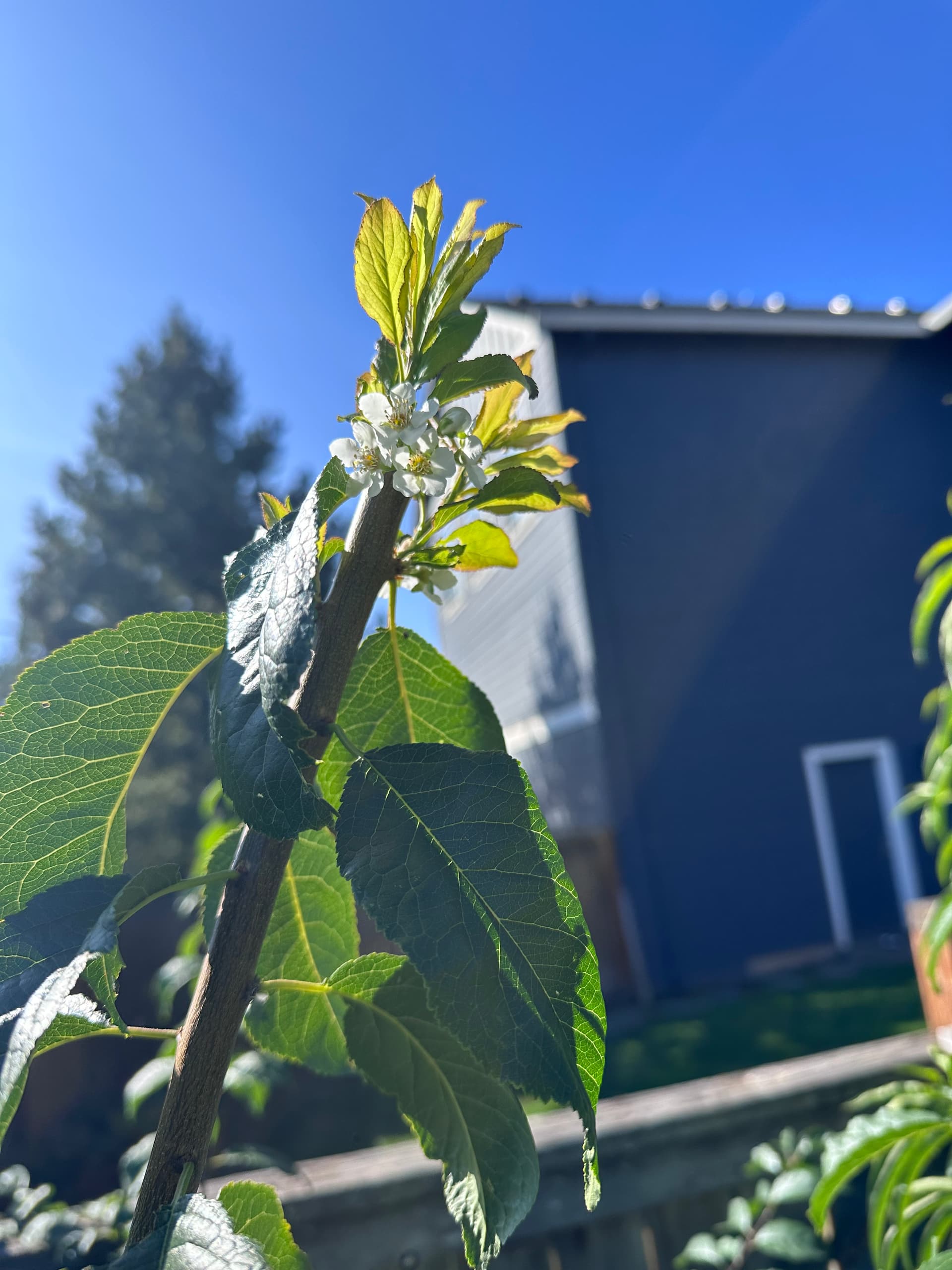 I pruned my apples and cherries this summer. As I mentioned my cherry tree has about 10 cluster of flowers, half the size of normal flowers. And one apple now has fruit! The bees took advantage! I have three small apples on my Pomme Gris du Canada!