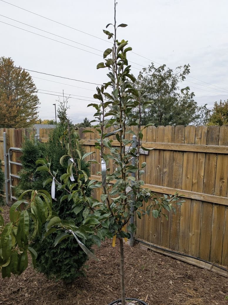 That said, I’m not sure how modified central leader would work with a different variety on each of those branches. It looks like there are 5-6 coming out of a very short piece of trunk? that makes me worried that if those branches get loaded they will split.