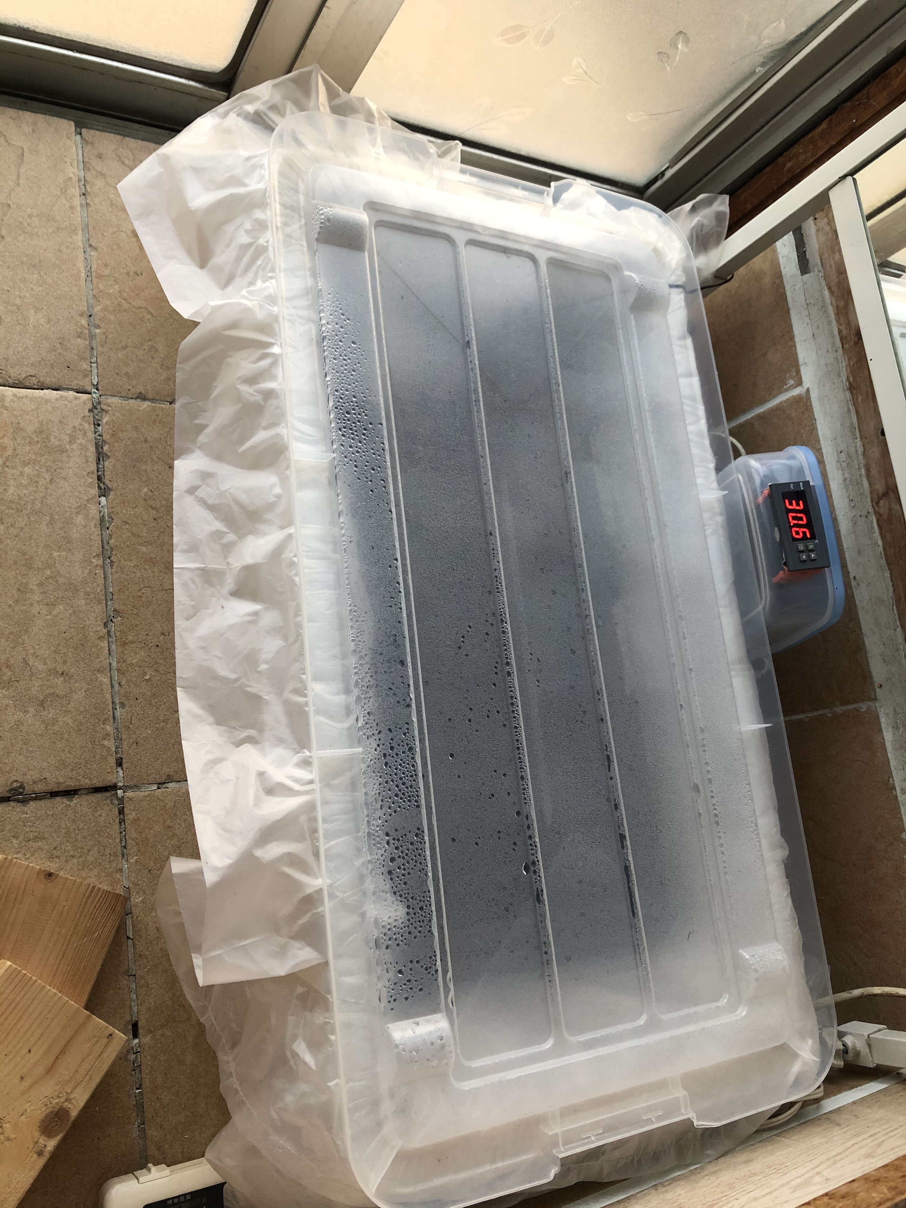 In order to maintain the temperature I have a clear plastic lid on top of the box I made. The room is quite cold at night, but gets very warm with the sunshine coming through the window. I put a blanket on top of it all as an insulator and it works well until they’re sprouting. But now it becomes a bit tricky to keep venting the box at the right times to get rid of excess humidity and heat from the sun while not letting it get too cold or dry inside. Also maximizing sun, along with a couple of led lights I have.