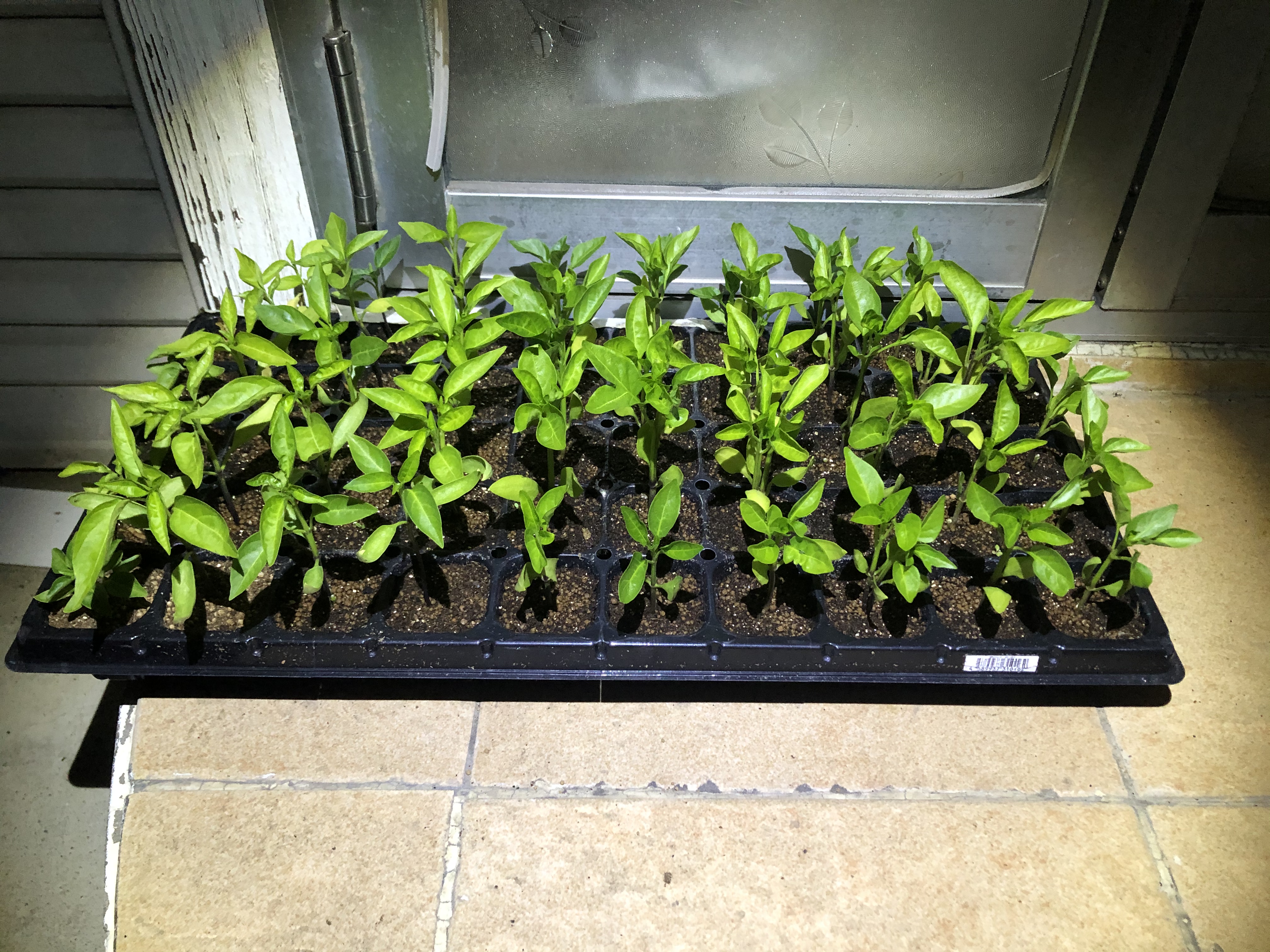 I’ve noticed some of the seedlings are quite pale and even getting discolored almost crispy leaf tips. The jalapeños are especially leggy. The direct sun is going through a corrugated glass and then through condensation-caked plastic lid, so I was hoping it’s not too powerfully direct. I really hope this soil type is OK for these seedlings. I had fabulous success just growing sweet peppers the first couple of years. But last year I lost all of them, possibly because the soil didn’t have any nutrients in it. This is my first time growing jalapeños and Tabasco from seed, as well as Sweet peppers. I may not have the same amount of time to continually baby them like I did the first couple of years.