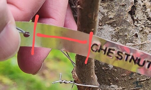 Here’s a good illustration. This is a graft from a year ago that I’d neglected to label, but did write on the tree with a sharpie: