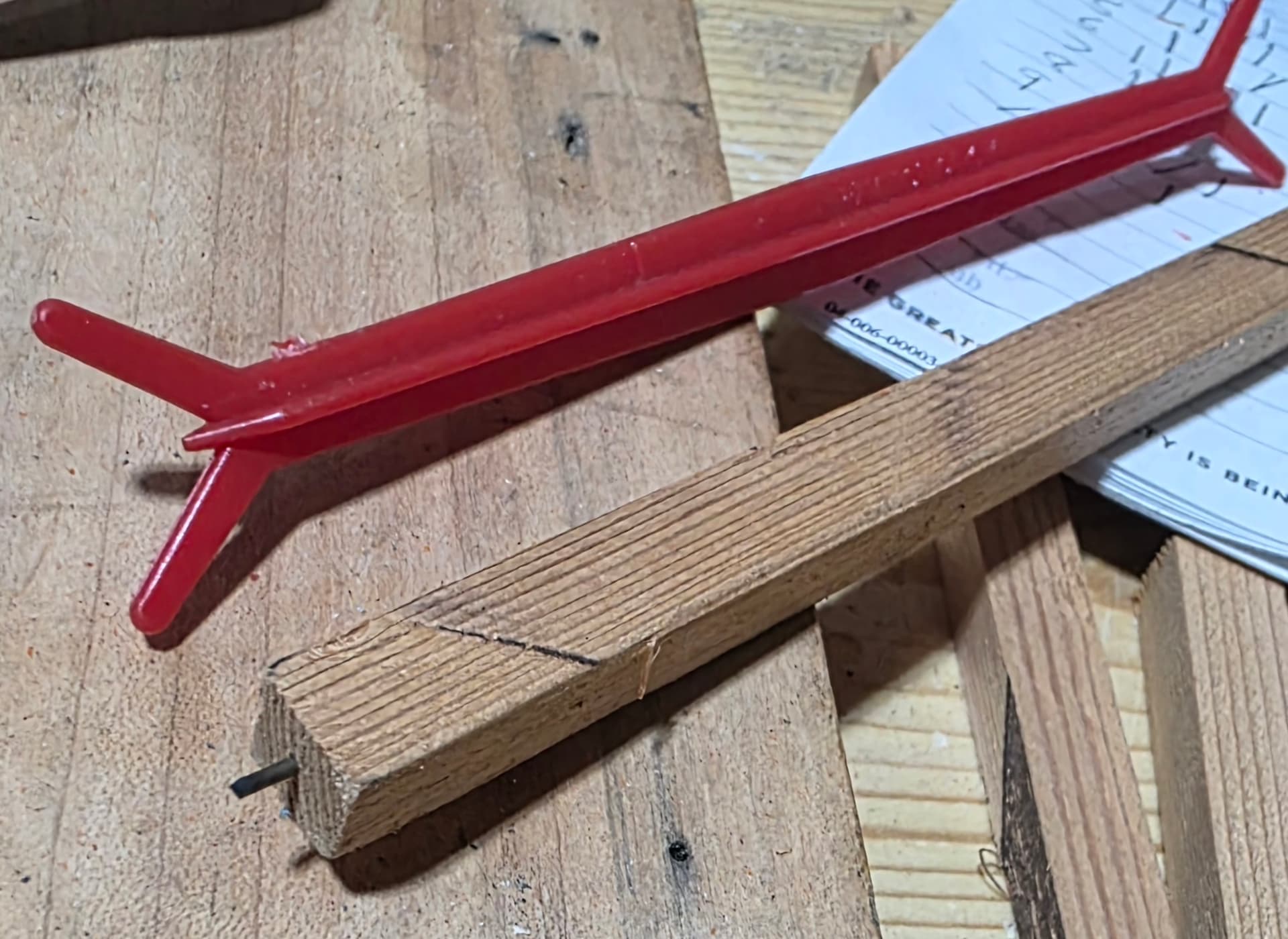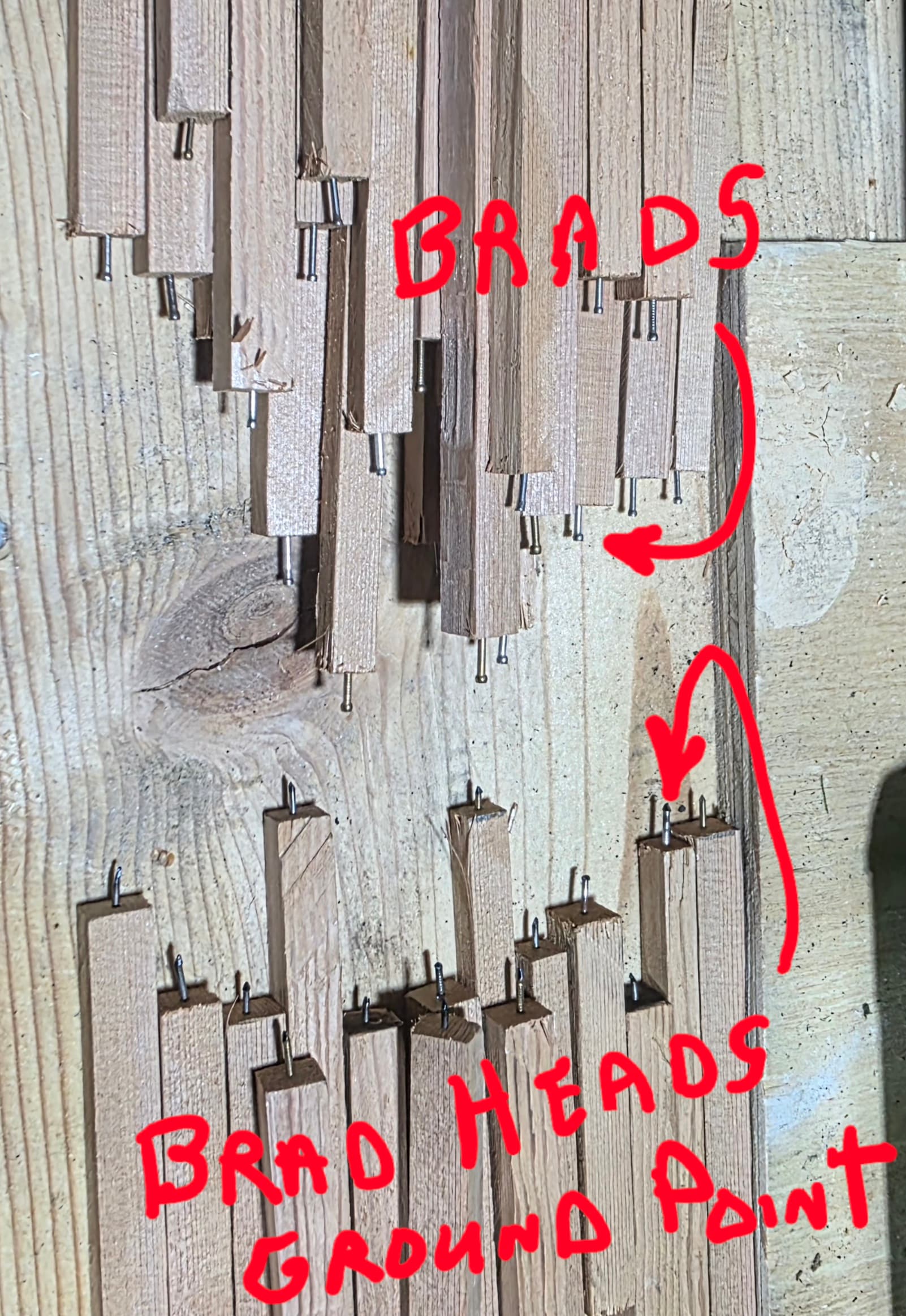 So I tried this with a piece of 3/8 x 3/8 cedar that I cut on the table saw. Put a brad in each end, head ground off to a point on the grinder. Will