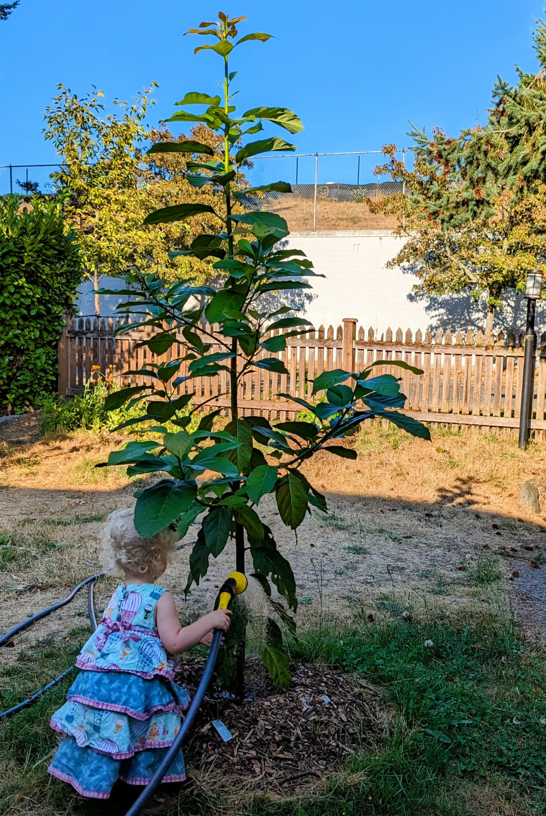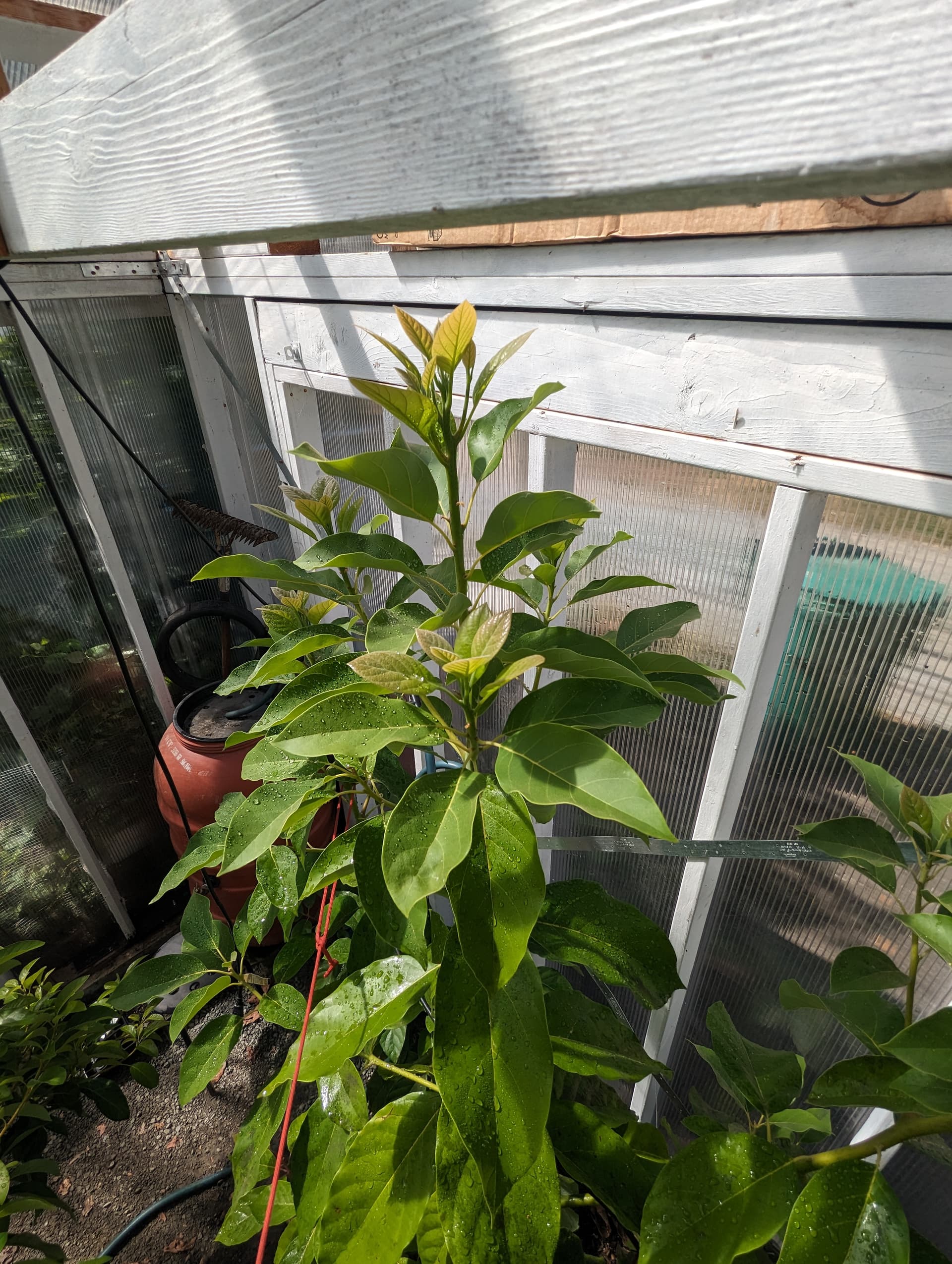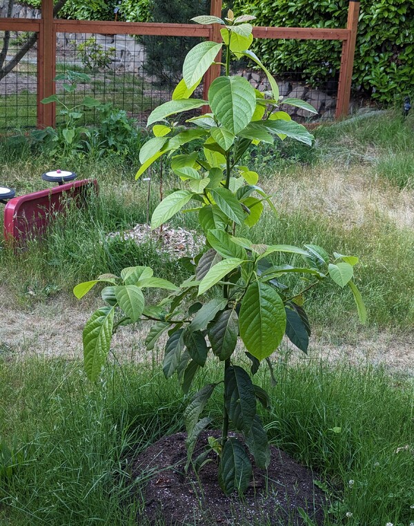 Very happy with the growth rate on this “Teague” tree on a Hass seedling rootstock, the first photo was when it went in the ground in January, second photo is what it looks like now, and that’s despite cutting 5 sticks of scionwood earlier this summer:
