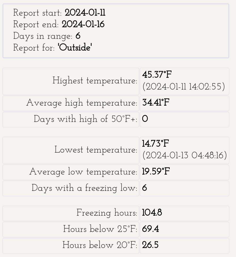 I just ran a comparison between what the covered tree #37 experienced in the January freeze and what the unprotected trees experienced. They both were cold, but it was a lot fewer hours in the worst freezing range: