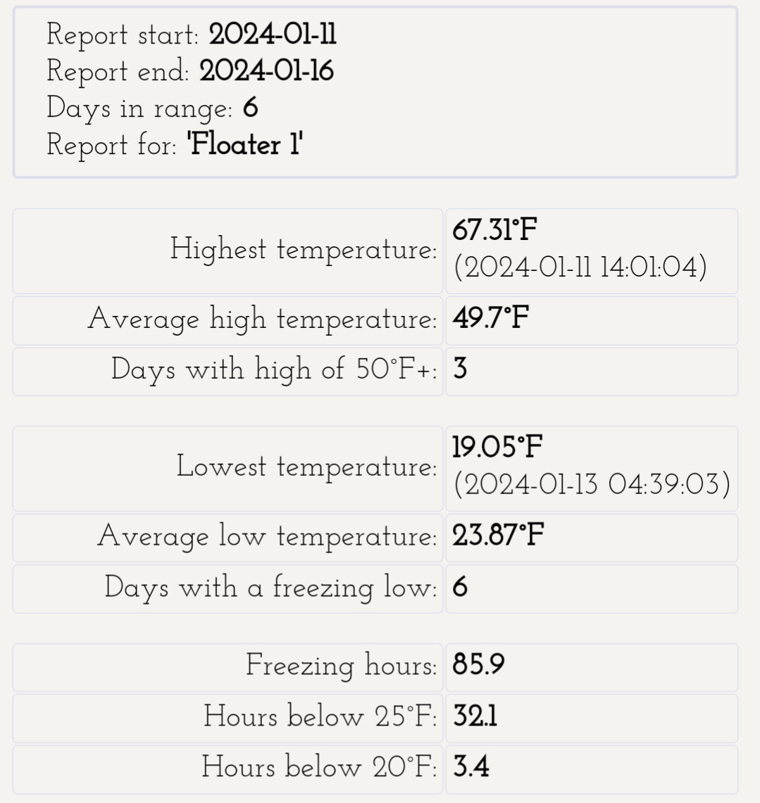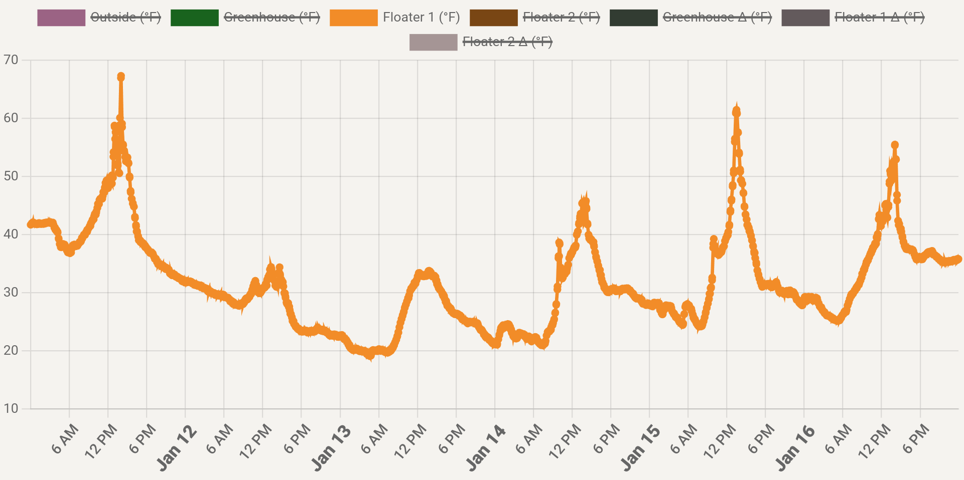That tree was covered, but still had a pretty cold freeze (low ~19°F), since it was not heated. The sensor “Floater 1” was inside its enclosure:
