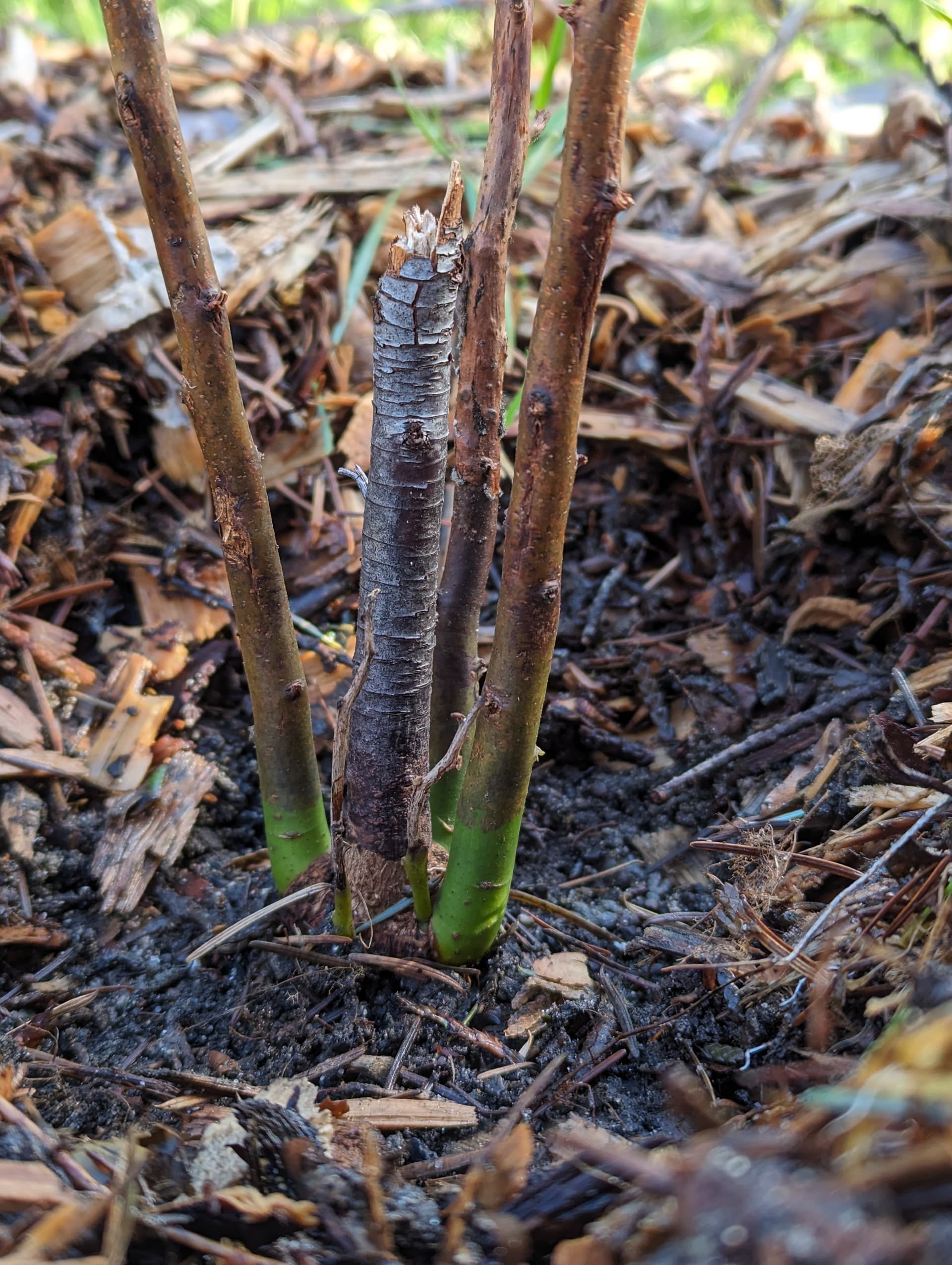 My in ground poncho pushing new growth assuming flowers to follow. Lila also pushing some new growth but behind the poncho