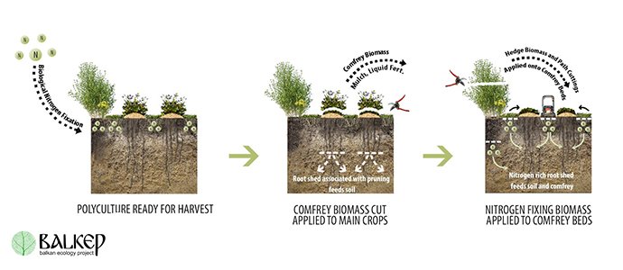 A related technique applicable to temperate climates is the Biomass Belt, composed of comfrey beds with clover in between and temperate nitrogen fixing trees off to the side.