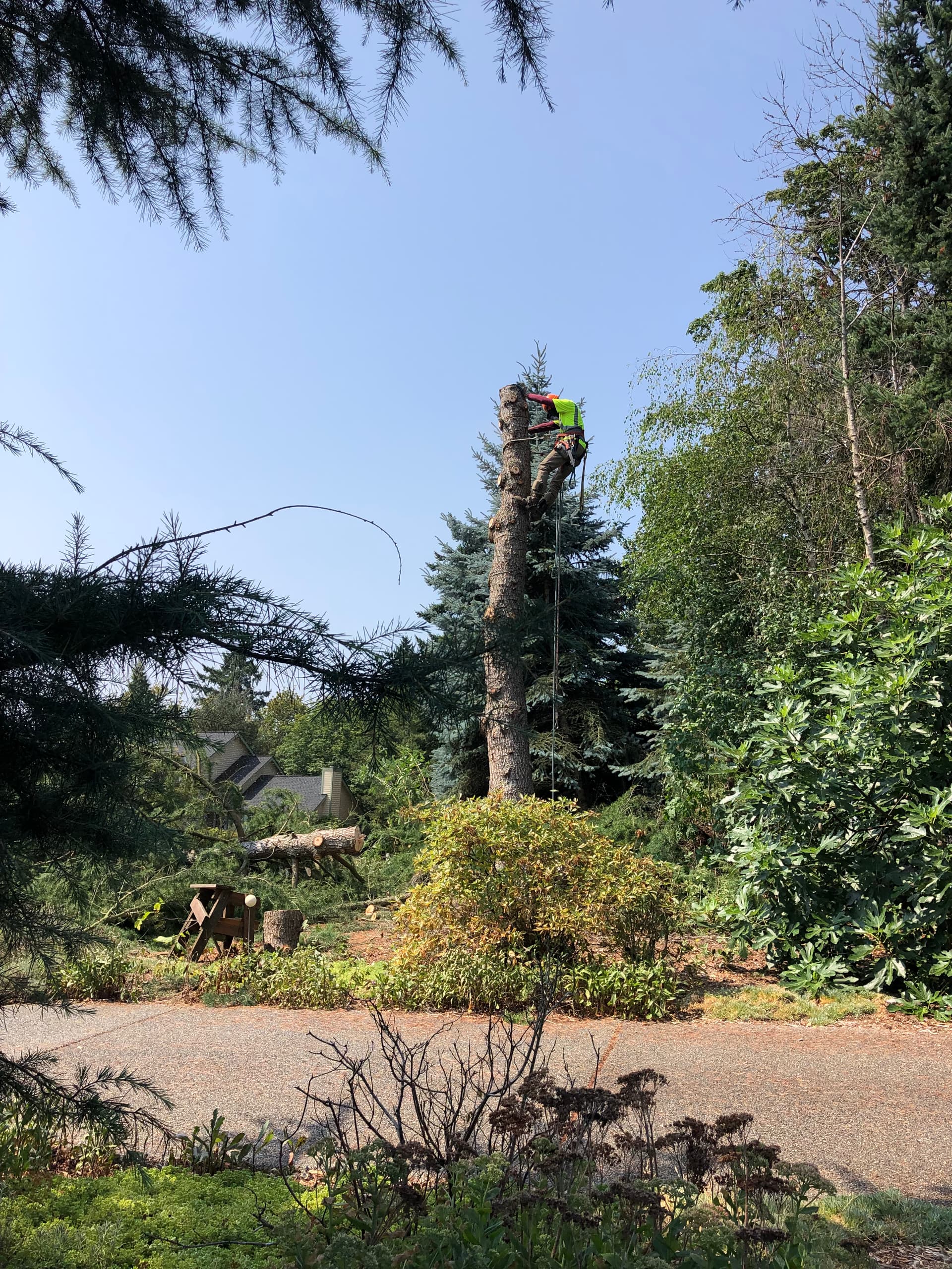 Tree climber removing one of two cedars