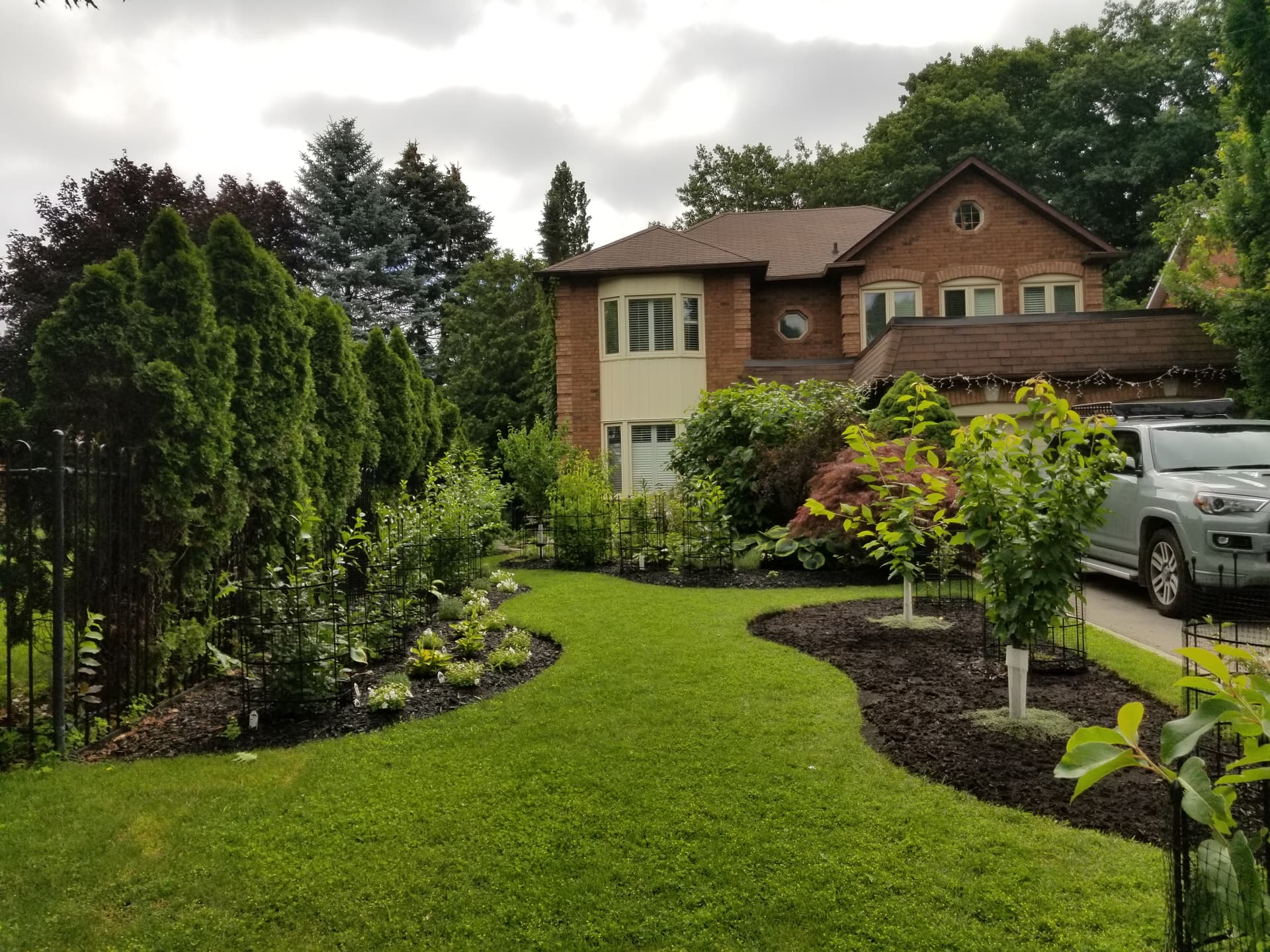 Since end of 2020 up to this spring planted at the front yard (to the left of the driveway): 3 different virieties of Cornelian Cherry, 5 x bush sour cherries (2 x Juliet, 2 x Cupid, 1 x Valentine), 2 x sweet cherries ( Black Tartarian and White Gold), 4 x Goumi Berry bushes, Donut peach, 2 x Persimmon trees ( Barbara Blush and Nikita’s Gift), Rekka blueberry, 3 x Crandall currants, 2 x yellow Primus currants, several bush red raspberries ( Shortcake), and some yellow raspberries Honey Queen and Anne. On the other side of the driveway 3 x Carmine Jewel sour cherries (tree form, already gave me 15 kg of cherries this summer) and some more bush red raspberries between cherry trees.