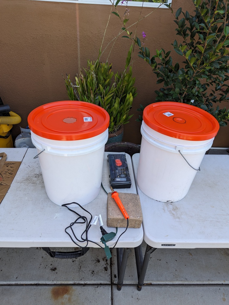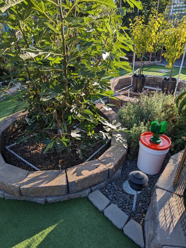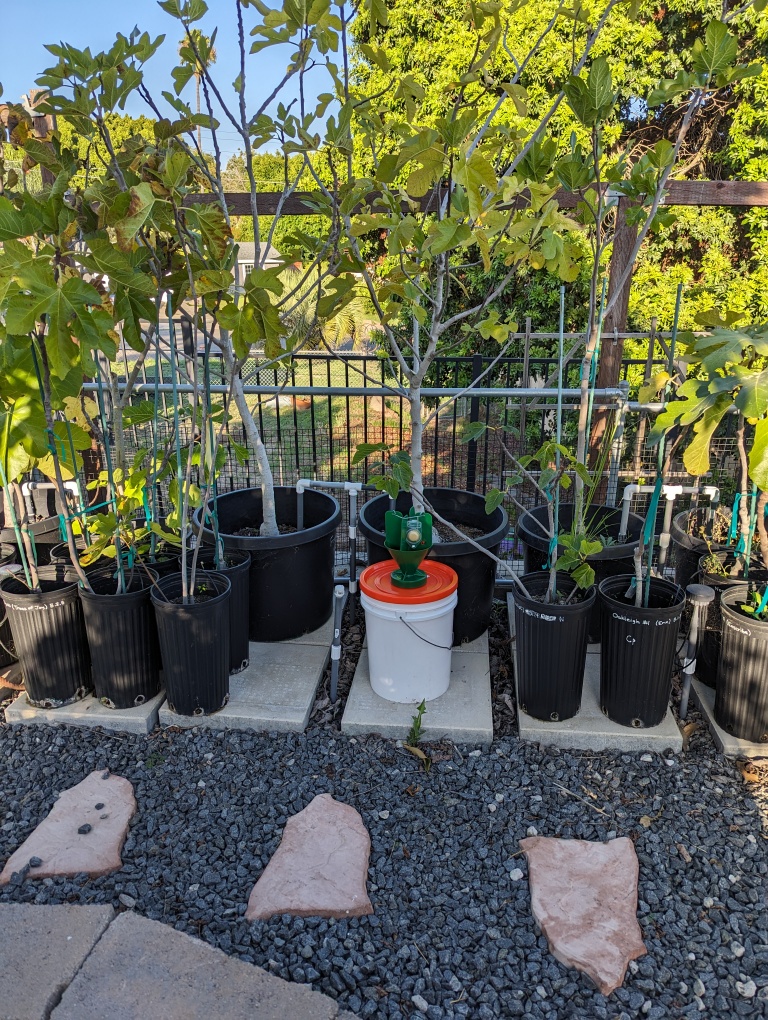 I put half a fig in the bottom of each bucket for good measure. I also found duct tape was necessary to hold the asphyxiant in place. One of the buckets is placed between my two in-ground figs, another with some large potted specimens, and the smaller Rescue traps among our fig repository.