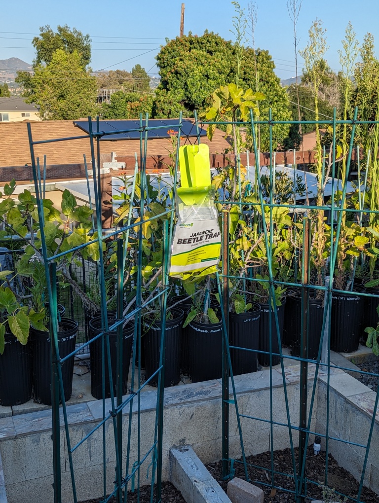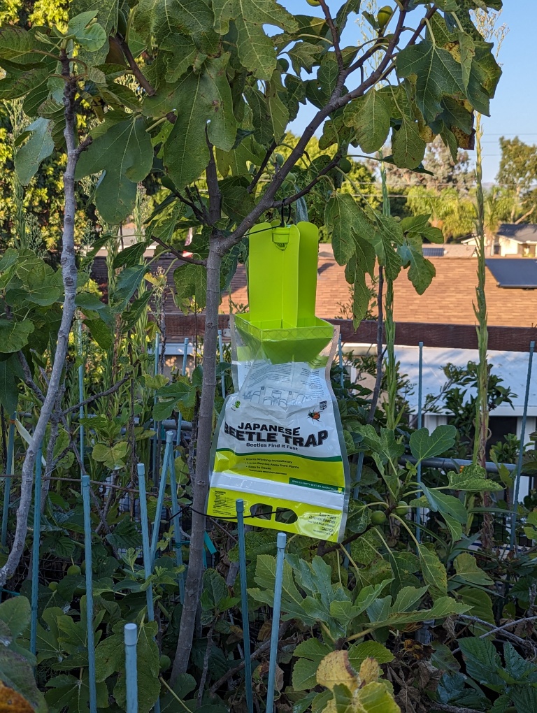 3 weeks ago I saw a solo Fruit Beetle flying around the yard and wasn’t having it. I ordered a few of the Trece traps and lures discussed in Clark’s original post and a few more of the Rescue brand sold on Amazon. By the way, I only found one seller there that ships to CA.