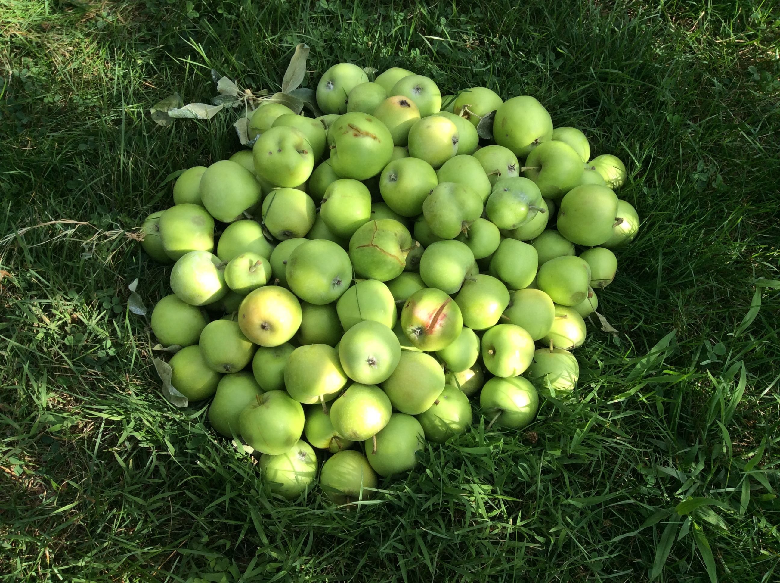 Thinned off another 140 Honey Crisp apples. Bugs definitely preferred HC to GR and Apears. You can see more bug damaged HC and cracks from recent rain, too.