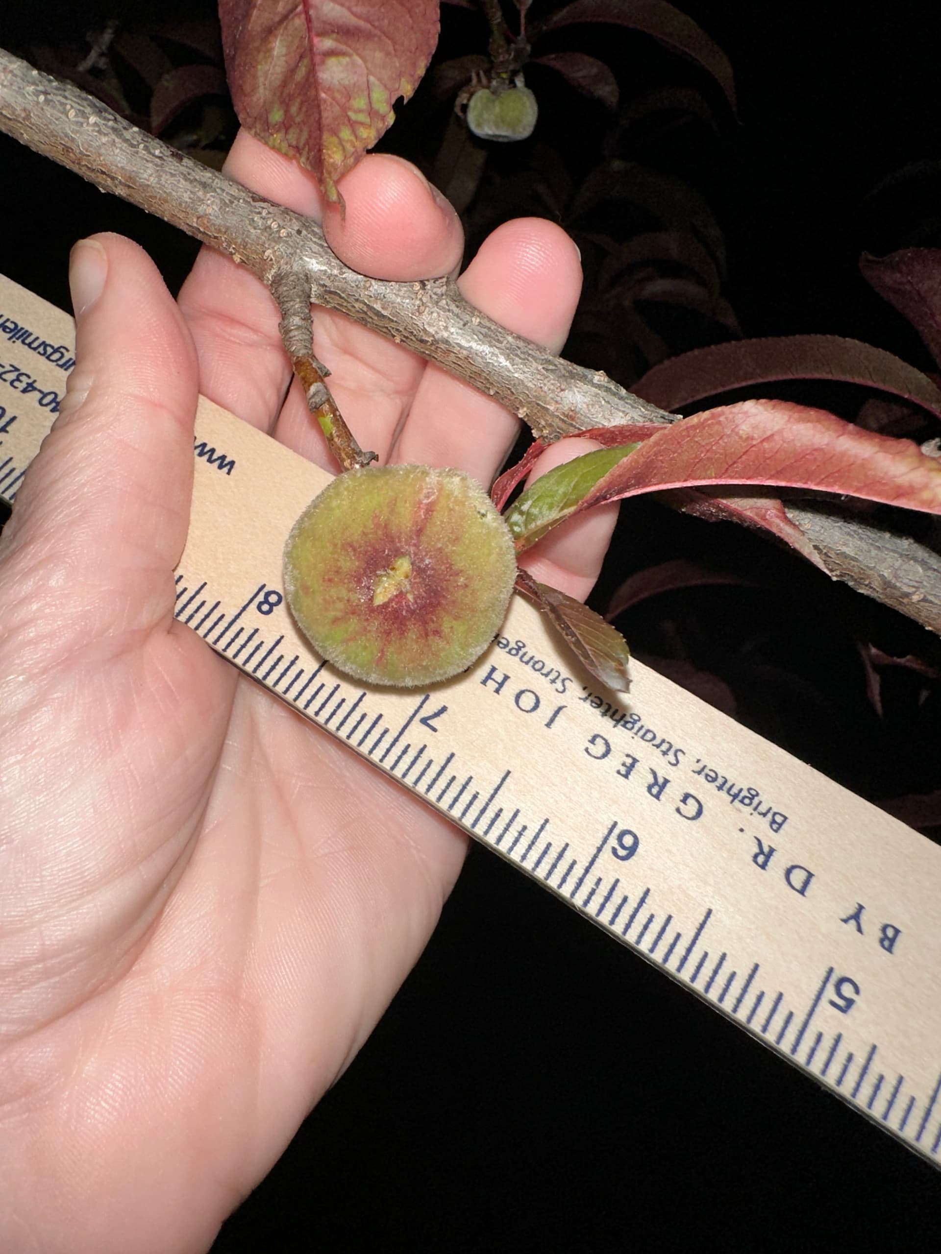 My peaches are smaller than golf ball - perhaps 1" in their longest dimension. Here is a flat wonderful and some other peach that is not flat