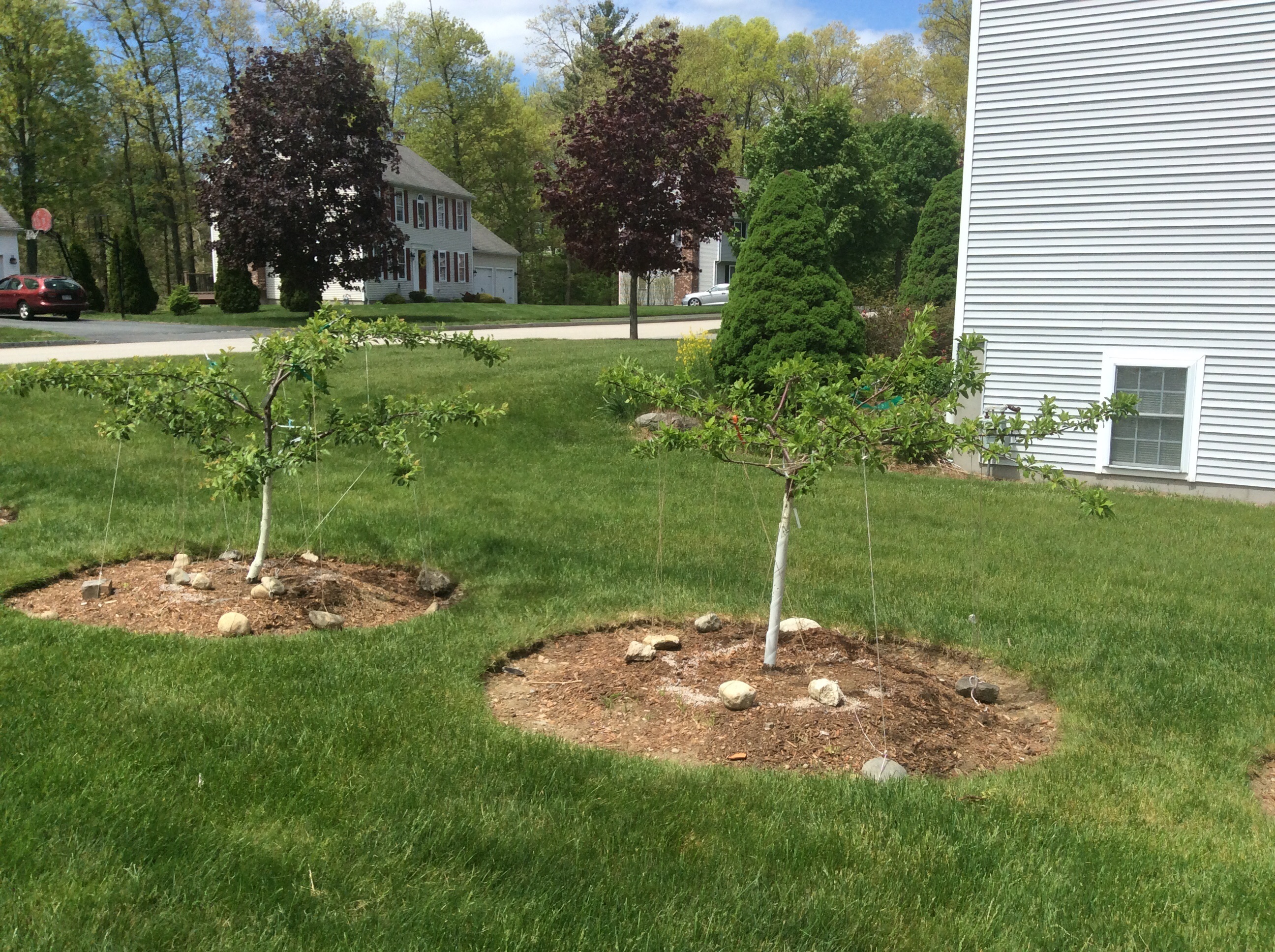 I have someone help me expanding a mulching area under each tree. So I can keep all the rocks inside the mulched areas, away from a lawn mower.