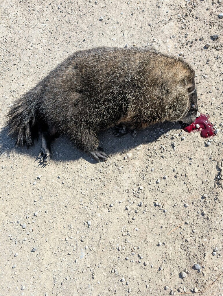 A friend has been a guest. The other day, my friend encountered a ground hog on the back roads. It charged out of the brush and directly into his car. He felt bad that happened as nobody enjoys when something dies. He jumped out to ensure it was not a pet. He called me and i assured him the buzzards or eagles or hawks will soon deal with it. I encouraged him not to mess with it because these situations often end badly. He asked what i meant. I said imagine you pick it up just as a game warden pulls up. He might think your enjoying ground hog stew tonight no matter what we know. Imagine you bag it to bring it back here for me to bury it or feed it to buzzards. What if it wakes up? The rule is if it is wild game leave it where it is. Someones garden is safer today. This is an unfortunate truth. A turkey, rabbit , or groundhog etc. panick and run into cars.
