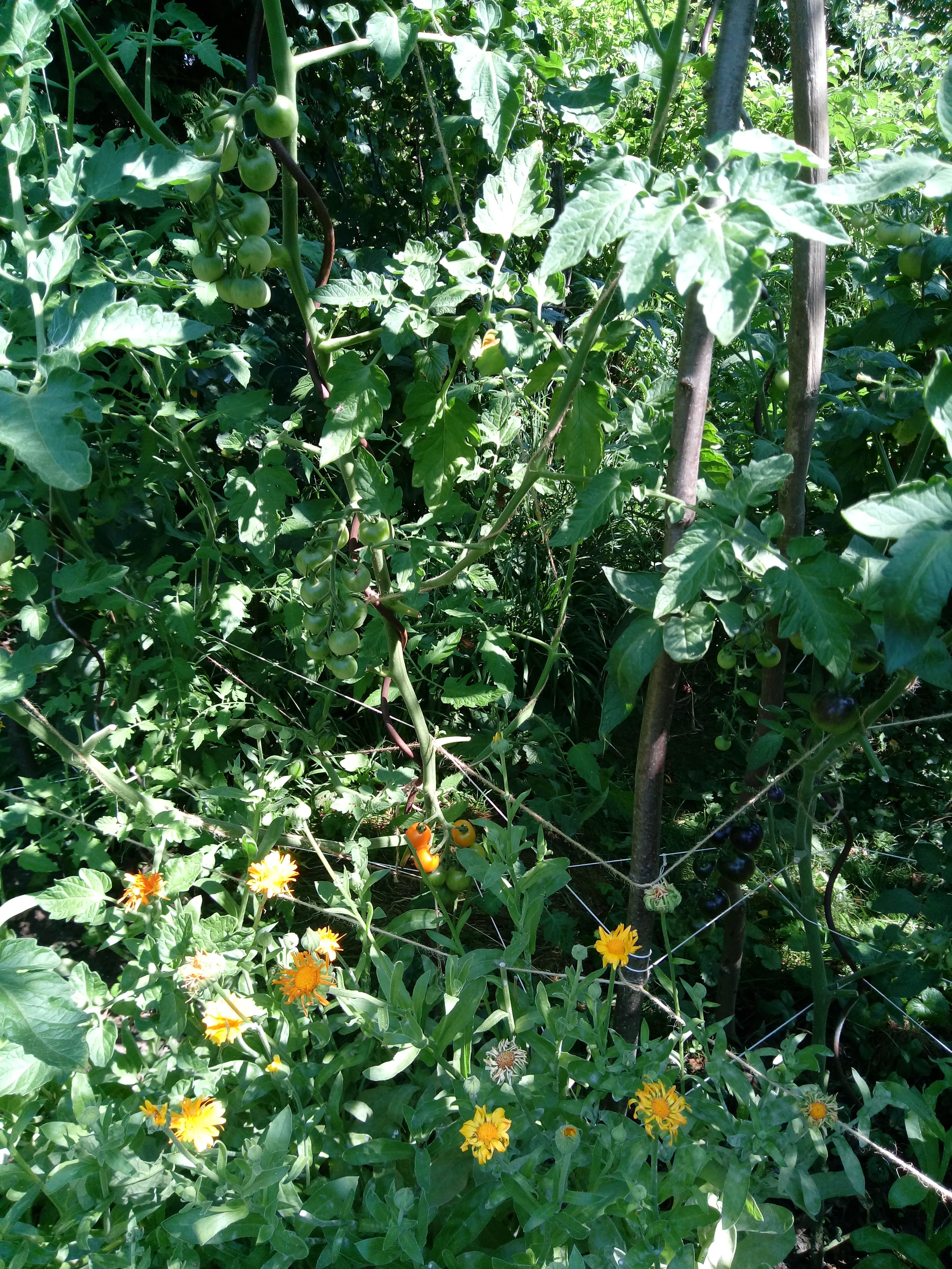 Our tomatoes have hardly set any fruit yet, but finally have lots of blossoms. They seem late this year. Nothing anywhere near ripe except one clump of a black cherry tomato.